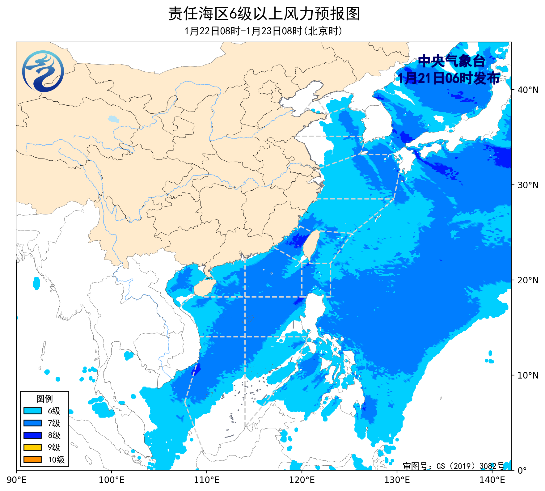 1月20日14时至21日02时,黄海北部海域、南海西北部海域、北部湾、南海中西部和南部海域出现了5~6级、阵风7级的东北风或偏北风,黄海中部海域出现了5~6级、阵风7级的西北风,黄海南部海域、东海大部海域、台湾海峡、台湾以东洋面、巴士海峡、南海东北部海域出现了6~8级、阵风9级的东北风或偏北风。