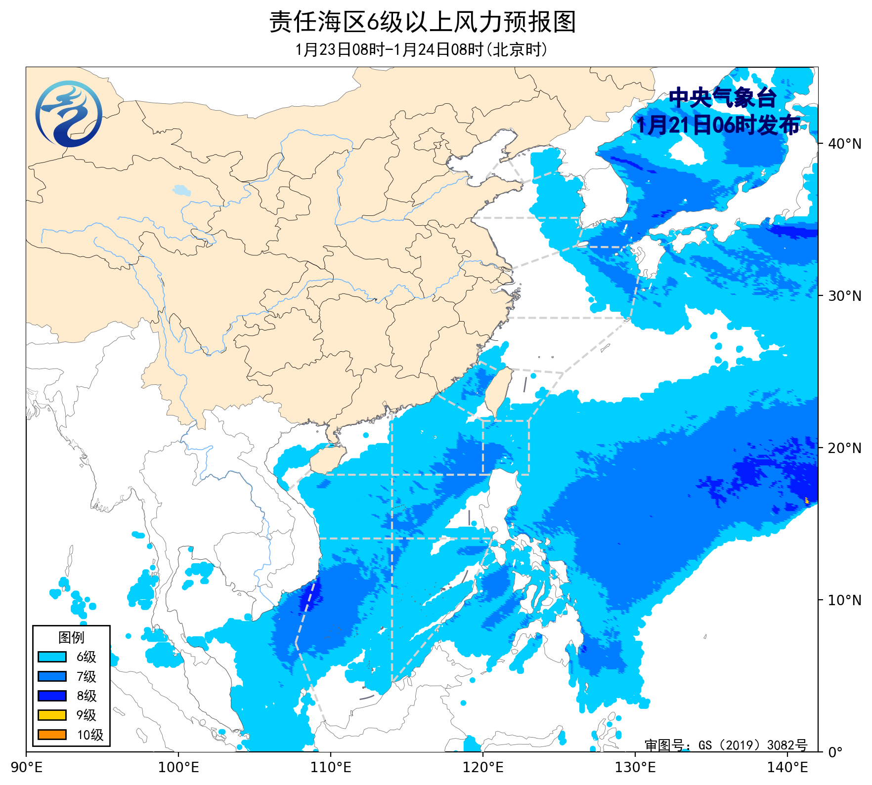23日08时至24日08时,台湾海峡、南海中东部海域将有5~7级、阵风8级的偏北到东北风,巴士海峡、南海东北部海域将有6~7级、阵风8级的东北风到偏东风,黄海大部海域、东海北部海域将有4~6级、阵风7级的偏西到西北风,台湾以东洋面、北部湾、南海西北部、中西部和南海东南部海域将有4~6级、阵风7级的偏东到东北风。