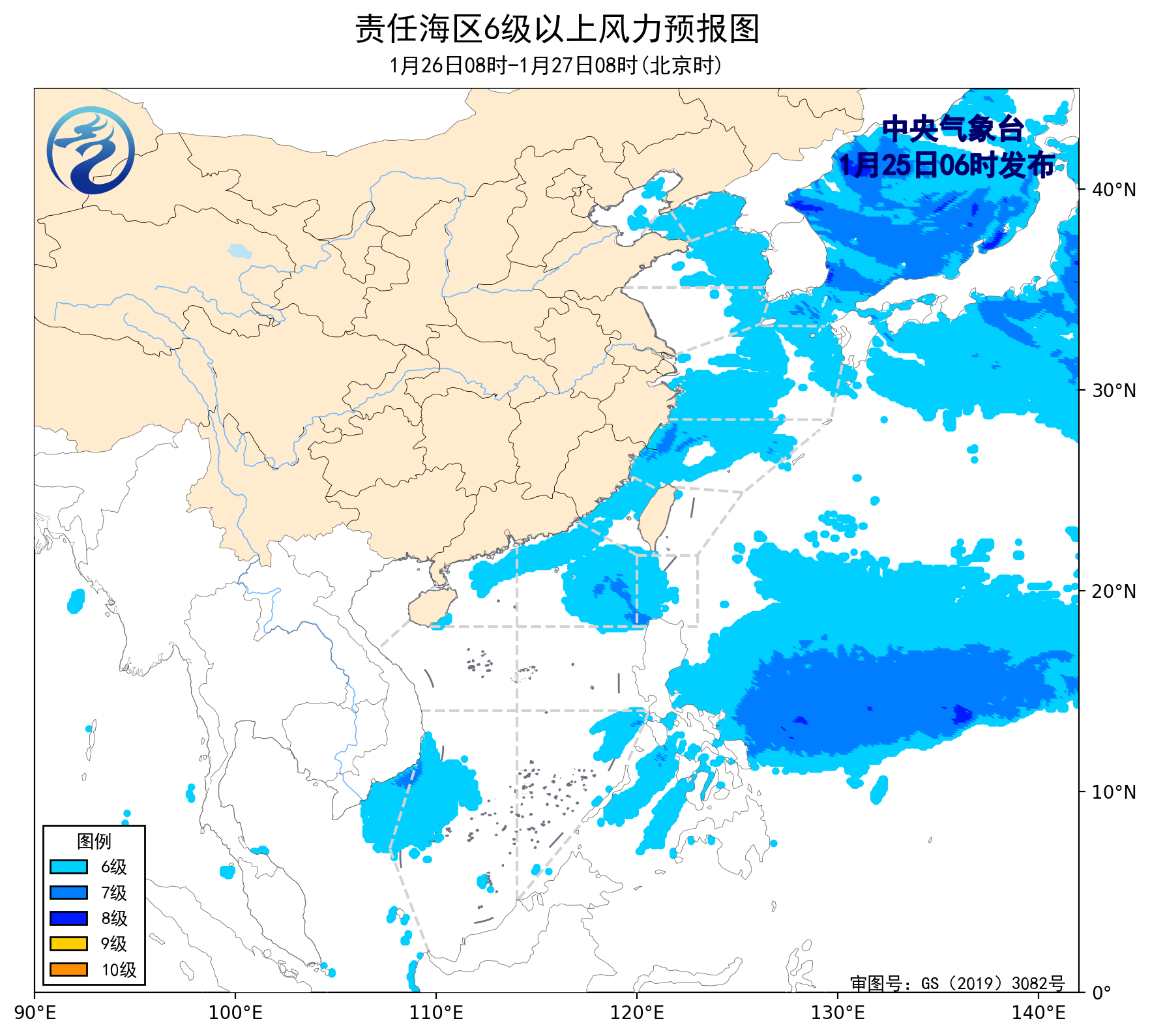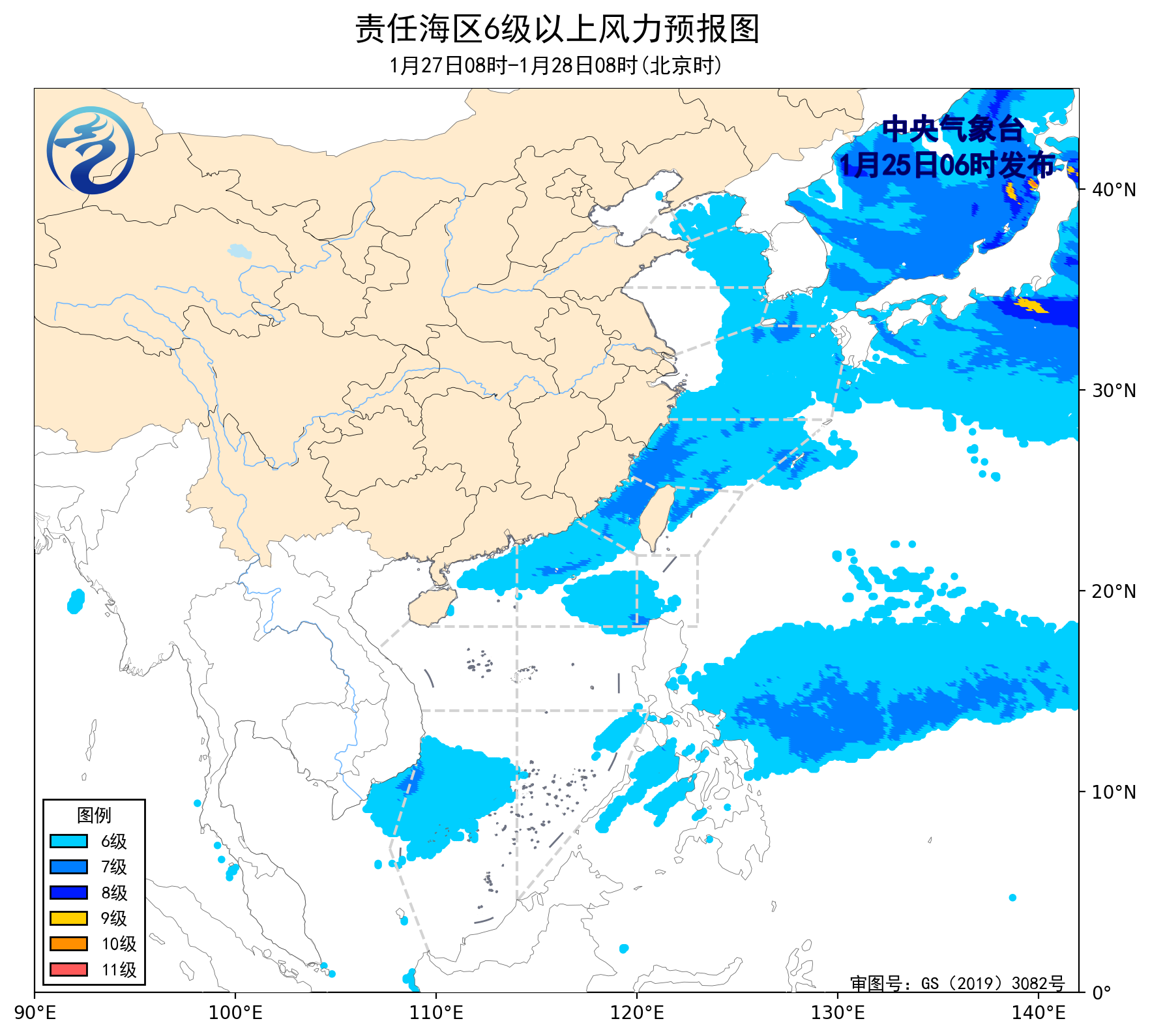 1月24日14时至25日02时,东海大部海域、台湾海峡、南海西南部海域出现了5~6级、阵风7级的东北风或偏北风,巴士海峡、南海东北部海域出现了5~6级、阵风7级的偏东风。