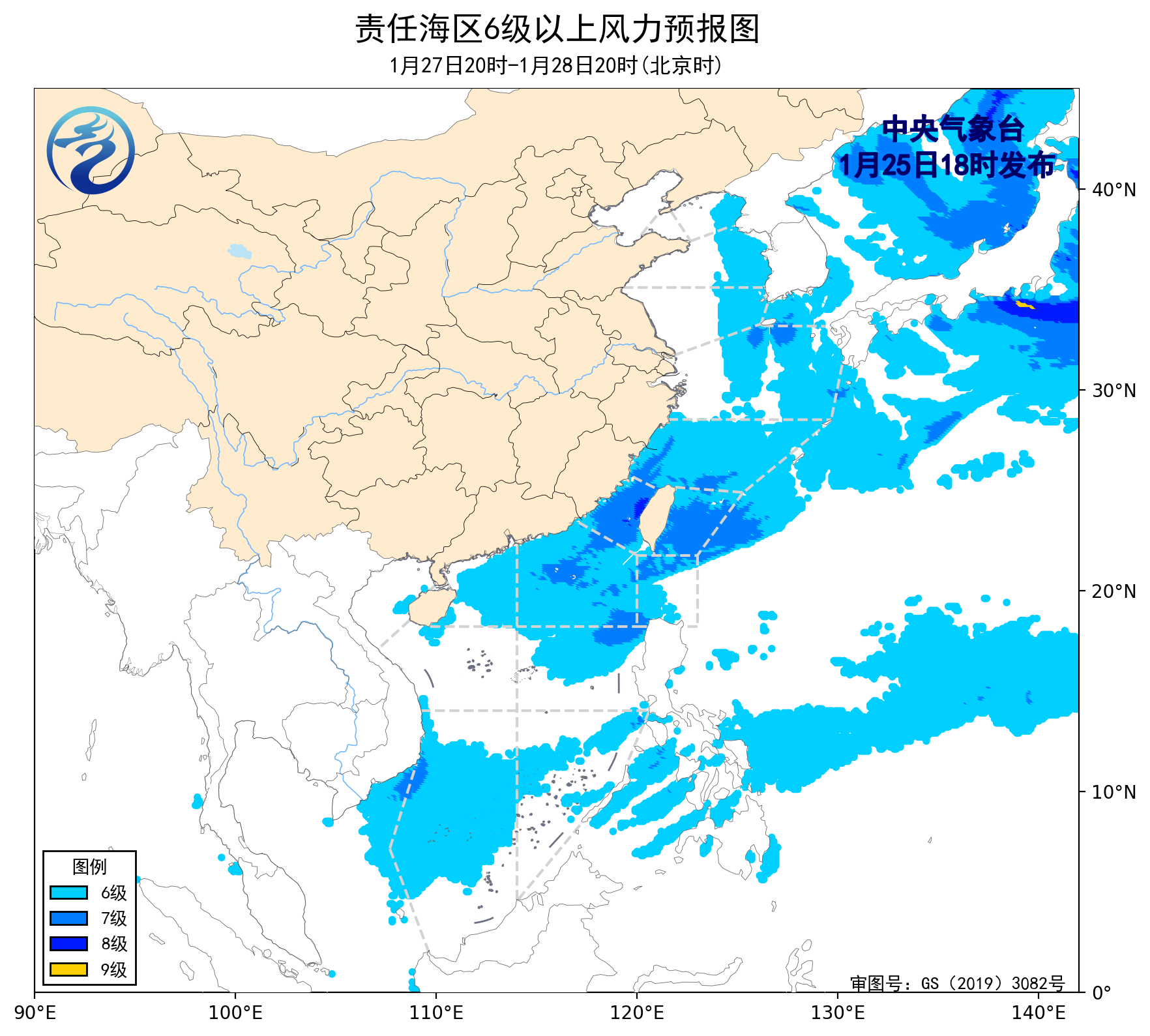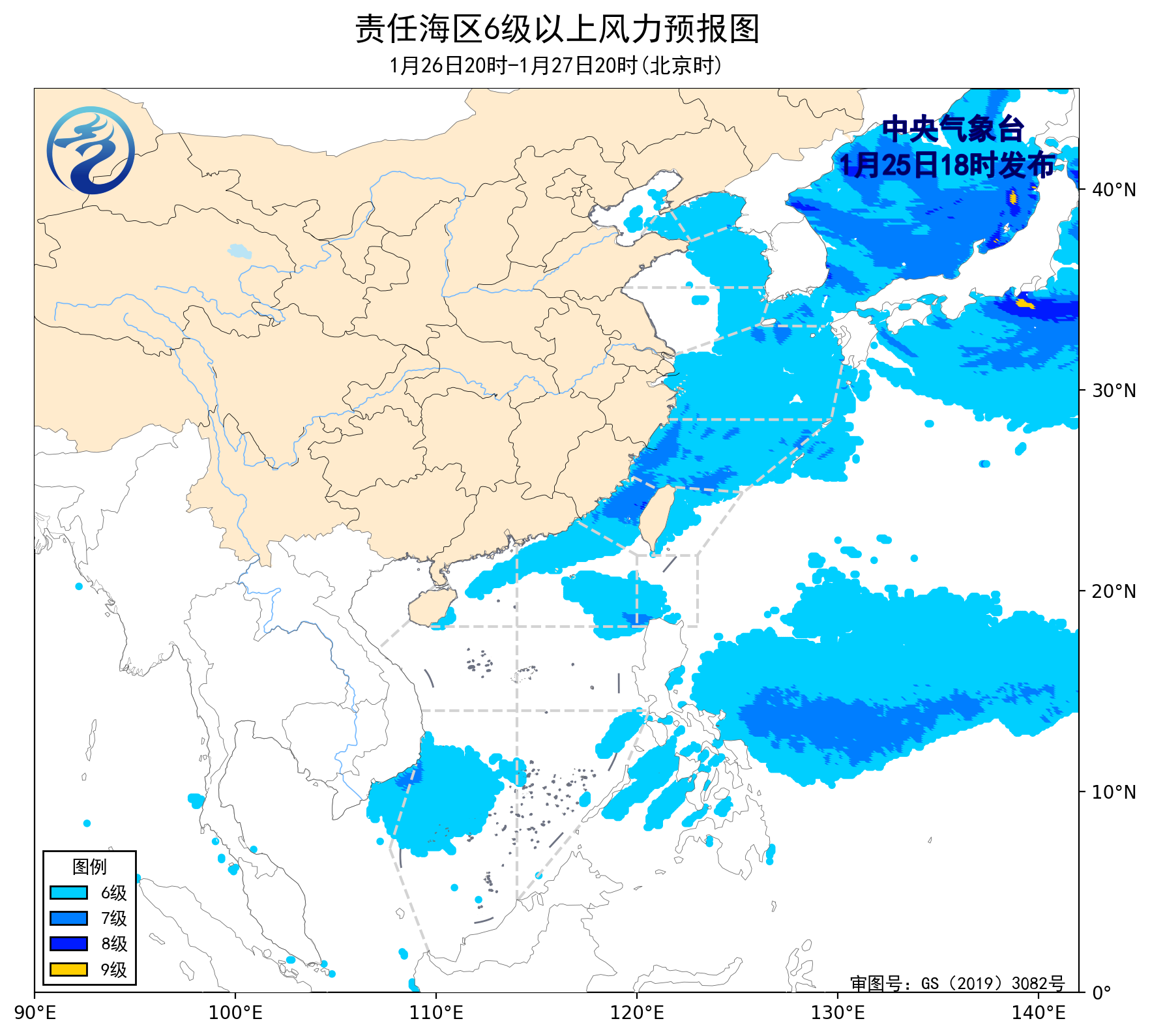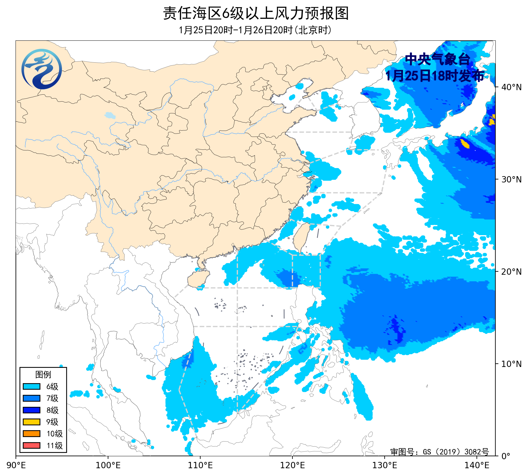 1月25日02时至14时,渤海出现了5~6级、阵风7级的偏西风,东海北部海域、台湾海峡、南海西南部海域出现了5~6级、阵风7级的偏北风,东海南部海域、巴士海峡出现了5~6级、阵风7级的偏东风。