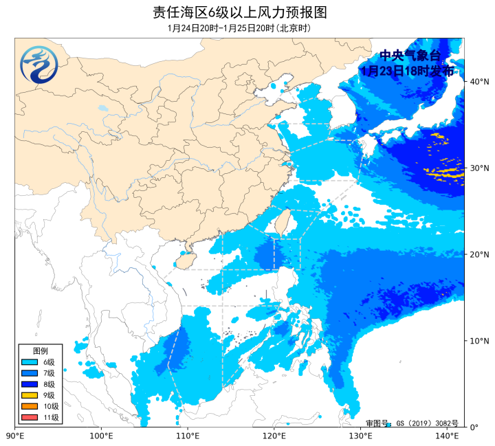 23日20时至24日20时,南海西南部海域将有6~7级、阵风8级的东北风,黄海大部海域、东海北部海域将有4~6级、阵风7级的西北风,东海南部海域、台湾海峡、南海中部、西北部和南海东南部海域将有4~6级、阵风7级的偏北到东北风,台湾以东洋面、巴士海峡、南海东北部海域将有5~6级、阵风7级的偏东到东北风。