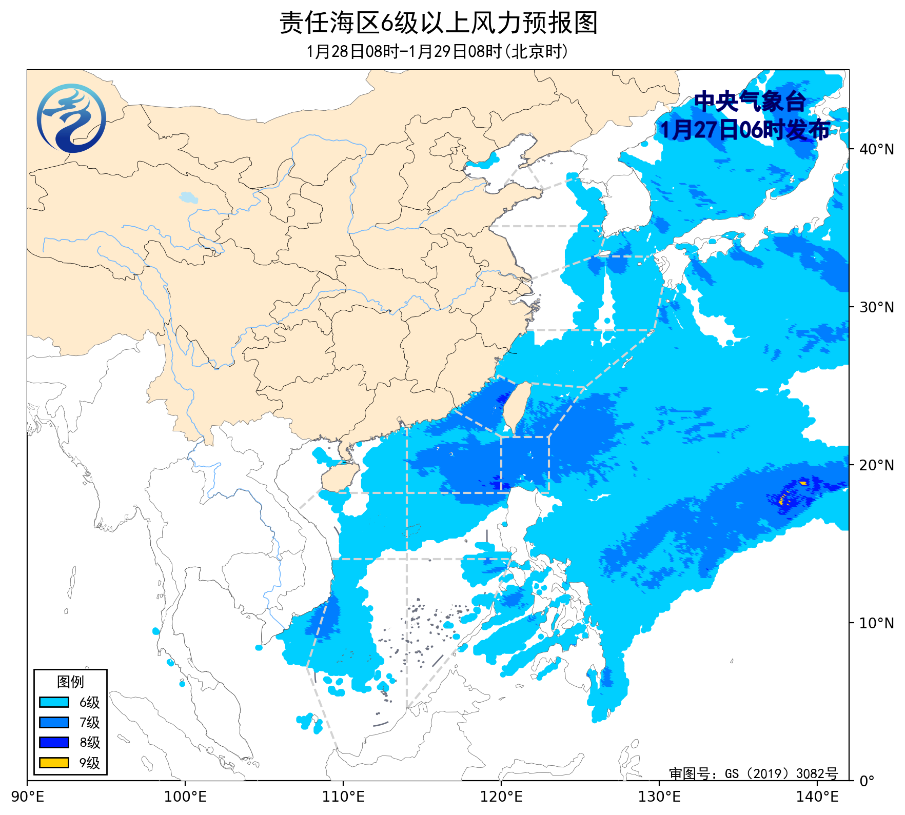 27日08时至28日08时,东海南部海域、台湾海峡、台湾以东洋面、南海东北部海域将有5~7级、阵风8级的偏北到东北风,渤海海峡将有5~6级、阵风7级的偏北风减弱到4级以下的东北风,黄海大部海域、东海北部海域、南海西部和中东部海域将有4~6级、阵风7级的偏北到东北风,巴士海峡将有5~6级、阵风7级的偏东到东北风。