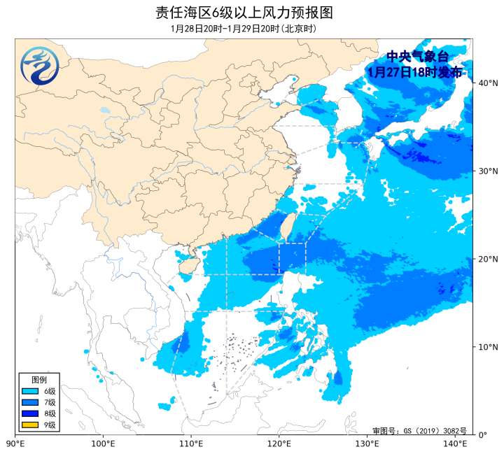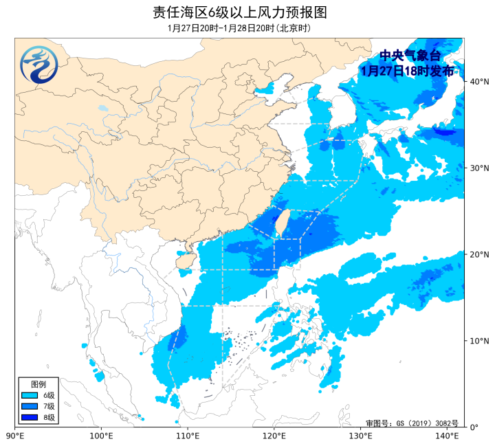 预计,1月30日夜间至2月1日白天,东海南部海域、台湾海峡、台湾以东洋面、巴士海峡、南海北部和西南部海域将有6~7级、阵风8级的风,其中东海南部部分海域风力可达9级、阵风10级,2月1日夜间至3日白天,渤海、渤海海峡、黄海大部海域、东海大部海域、台湾海峡、台湾以东洋面、巴士海峡、南海大部海域将先后有6~7级、阵风8级的风。