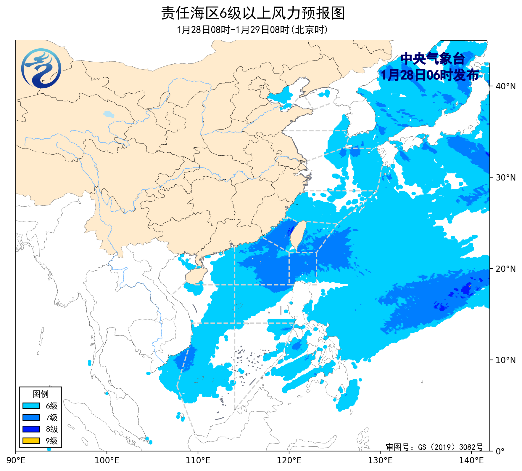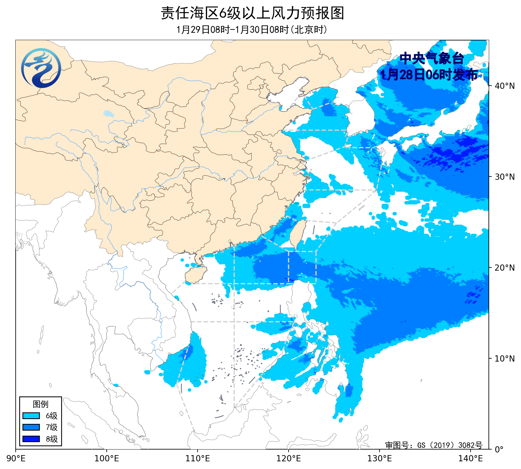 28日08时至29日08时,台湾海峡、台湾以东洋面、巴士海峡、南海东北部海域将有5~7级、阵风8级的偏东到东北风,黄海南部海域、东海大部海域、南海中部和西南部海域将有4~6级、阵风7级的偏北到东北风,渤海、南海西北部和东南部海域将有4~6级、阵风7级的偏东到东北风。