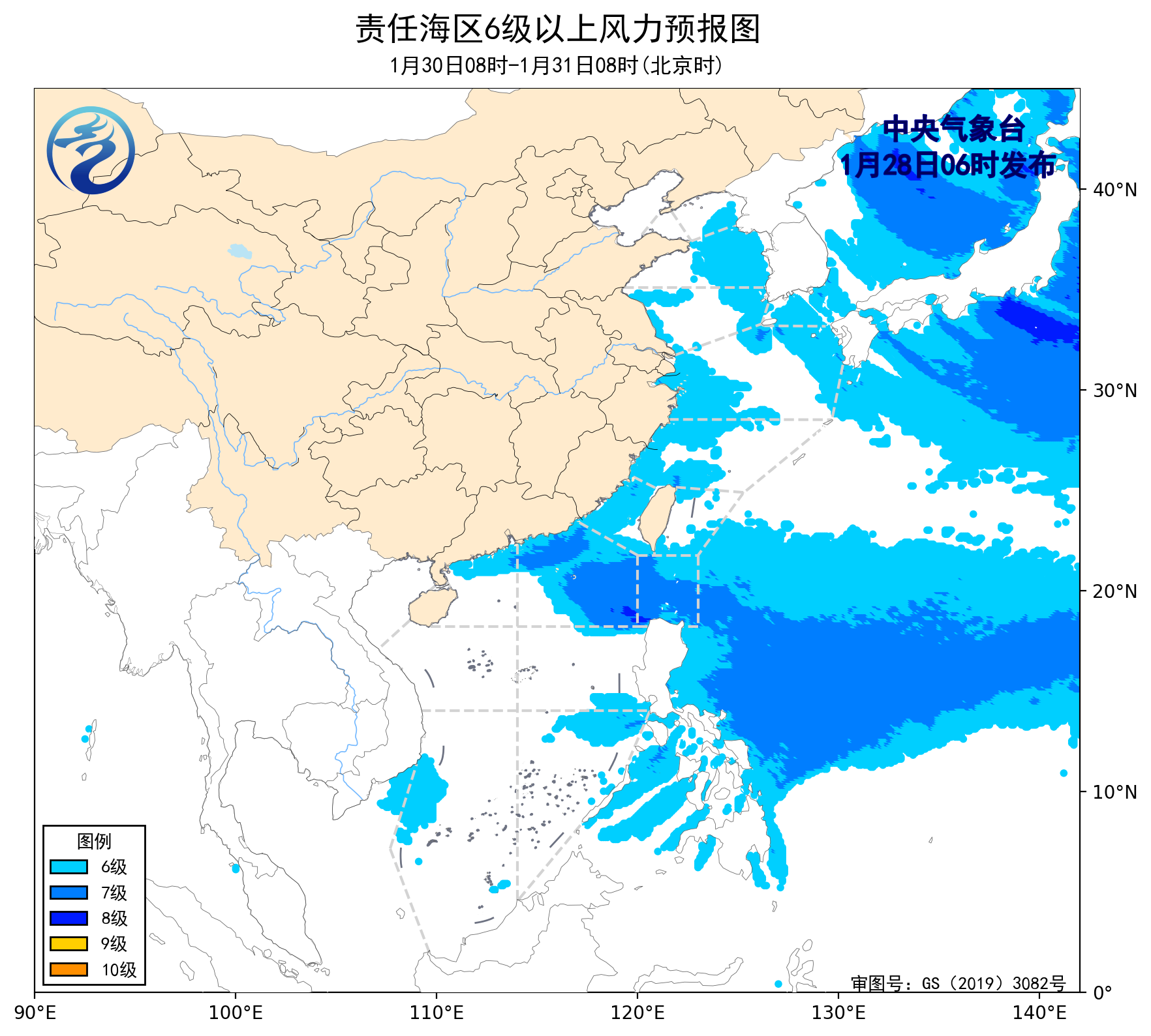 30日08时至31日08时,巴士海峡、南海东北部海域将有6~7级、阵风8级的偏东风,黄海北部海域将有5~6级、阵风7级减弱到4级以下的偏北风,黄海中部和南部海域将有4~6级、阵风7级的偏北风,东海北部海域将有5~6级、阵风7级的西北风转东北风,东海南部海域、台湾以东洋面将有4~6级、阵风7级的偏东转偏南风,台湾海峡将有5~6级、阵风7级的偏北转偏东风,南海西北部、中东部和南海东南部海域将有4~6级、阵风7级的偏东到东北风。