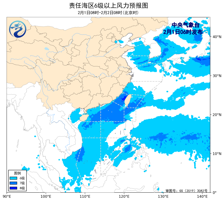 1月31日14时至2月1日02时,东海大部海域、台湾海峡、台湾以东洋面、南海北部海域、南海西南部海域出现了5~7级、阵风8级的东北风或偏北风,巴士海峡出现了5~6级、阵风7级的偏东风。