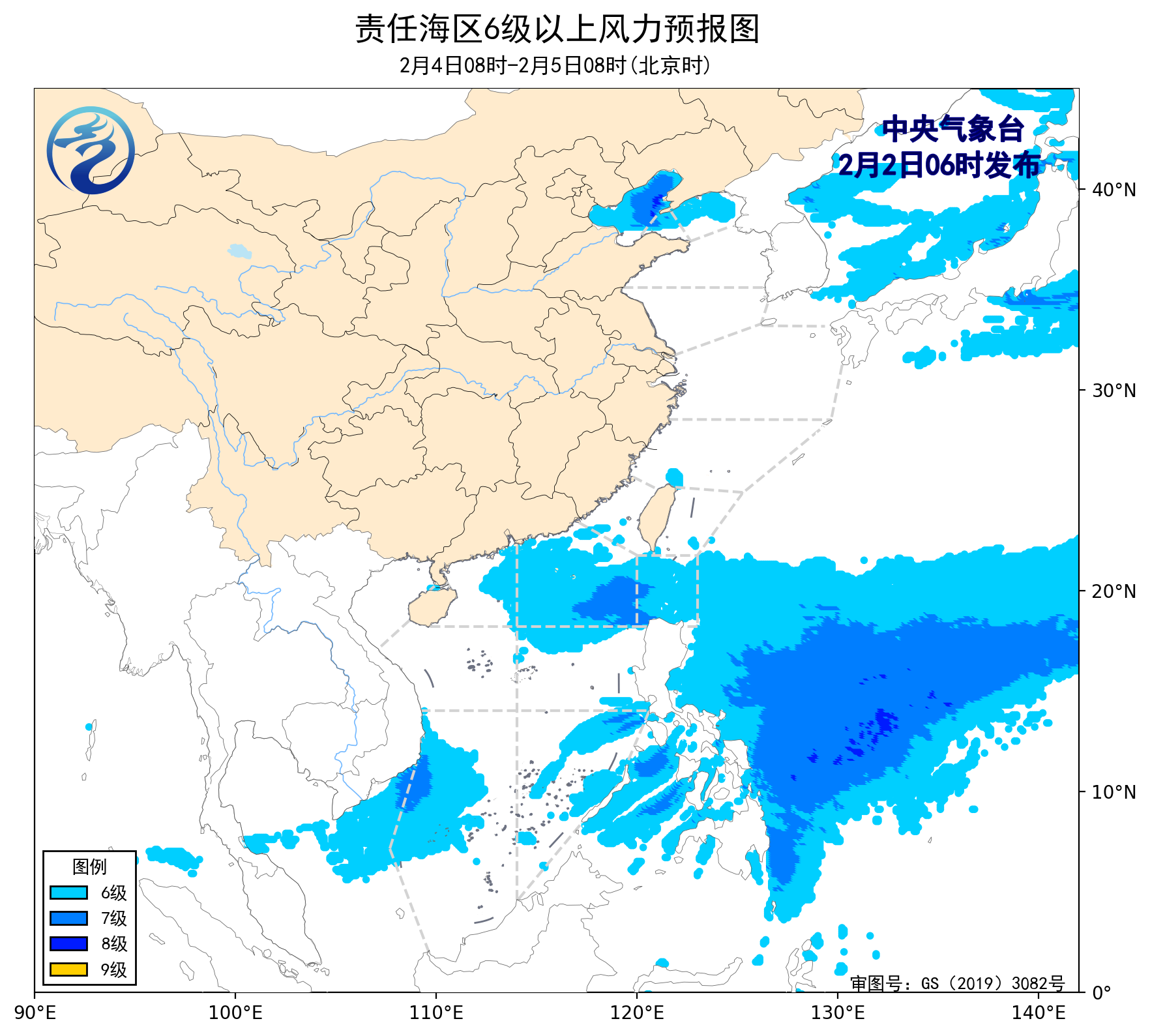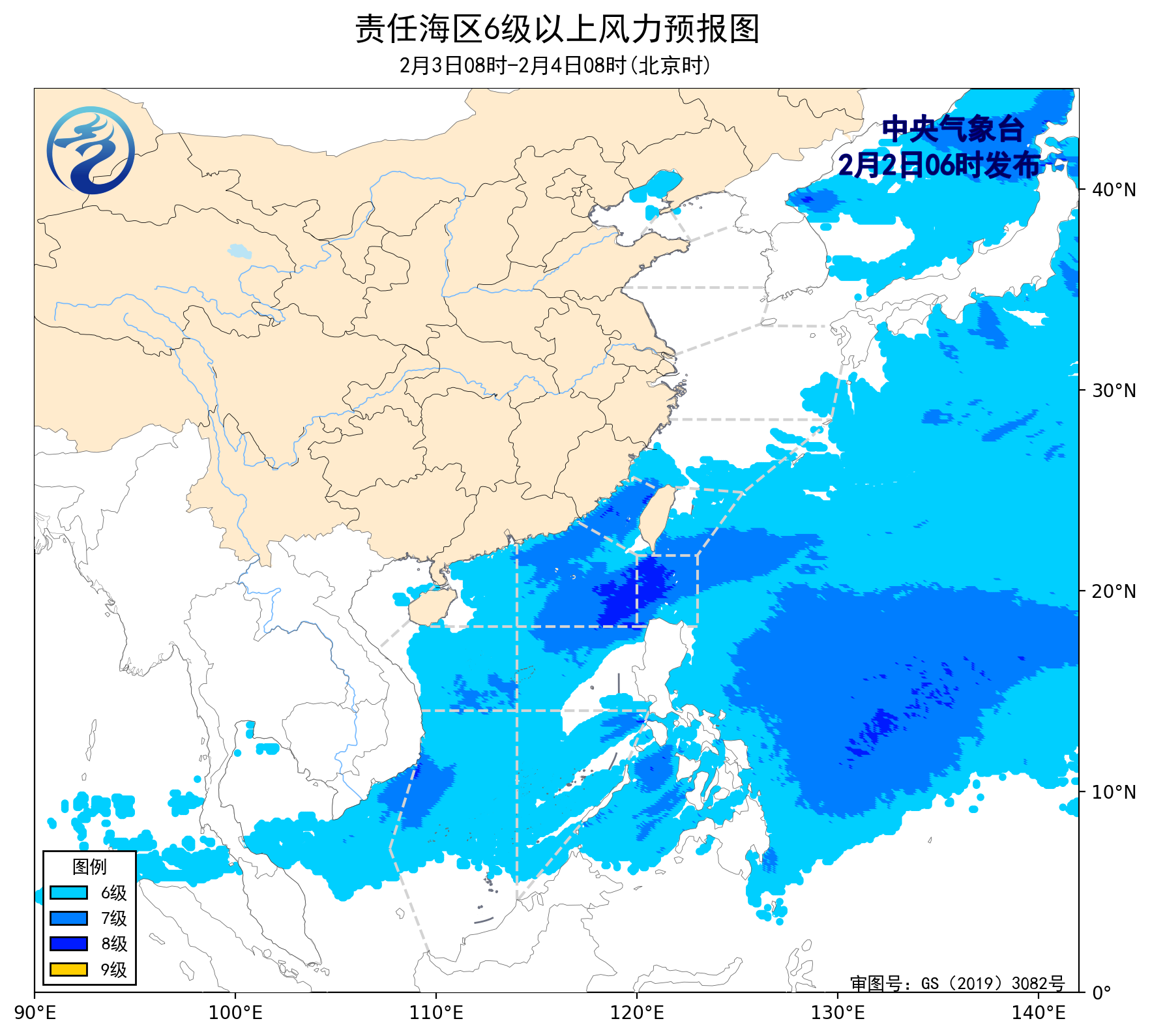 2日08时至3日08时,台湾海峡、巴士海峡将有6~8级、阵风9级的东北风,东海北部海域将有6~7级、阵风8级的西北风到偏北风,台湾以东洋面、南海西部、东北部和南海中东部海域将有5~7级、阵风8级的东北风,黄海中部和南部海域将有4~6级、阵风7级的西北风,东海南部海域、北部湾、南海东南部海域将有5~6级、阵风7级的东北风。