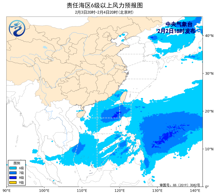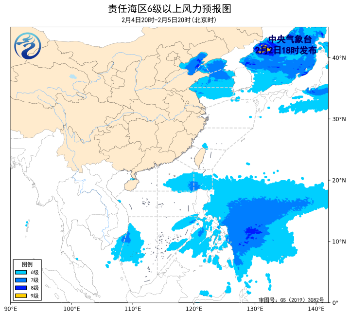 预计,2月5日夜间至9日白天,渤海、渤海海峡、黄海大部海域、东海大部海域、台湾海峡、台湾以东洋面、巴士海峡、南海大部海域、北部湾将先后有6~8级、阵风9级的风,其中5日夜间至7日白天,东海东部的部分海域风力可达9级、阵风10级,7日夜间至9日白天,台湾海峡、巴士海峡、南海东北部的部分海域可达9级、阵风10级。
