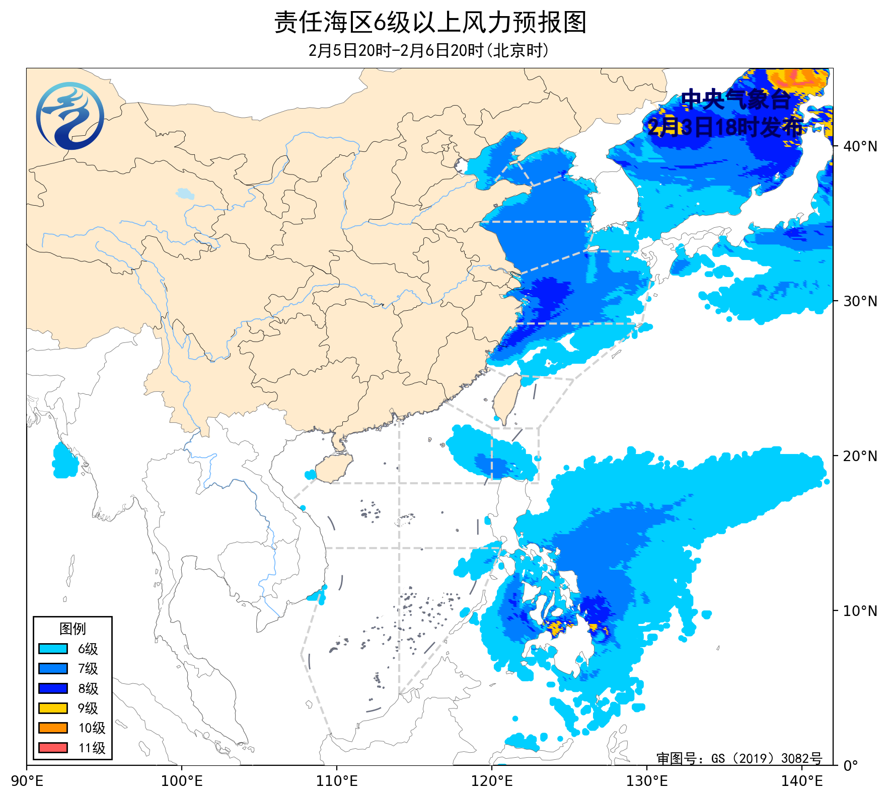 预计,2月6日夜间至2月10日夜间,渤海、渤海海峡、北部湾、琼州海峡将有6~7级、阵风8级的风,黄海大部海域将有6~8级、阵风9级的大风,东海大部海域将有8~9级、阵风10级的大风,台湾海峡将有6~7级、阵风8级增大至9~10级、阵风11级的大风,台湾以东洋面、南海大部海域将有6~7级、阵风8级增大至8~9级、阵风10级的大风,巴士海峡将有7~8级、阵风9级增大至9~10级、阵风11级的大风。
