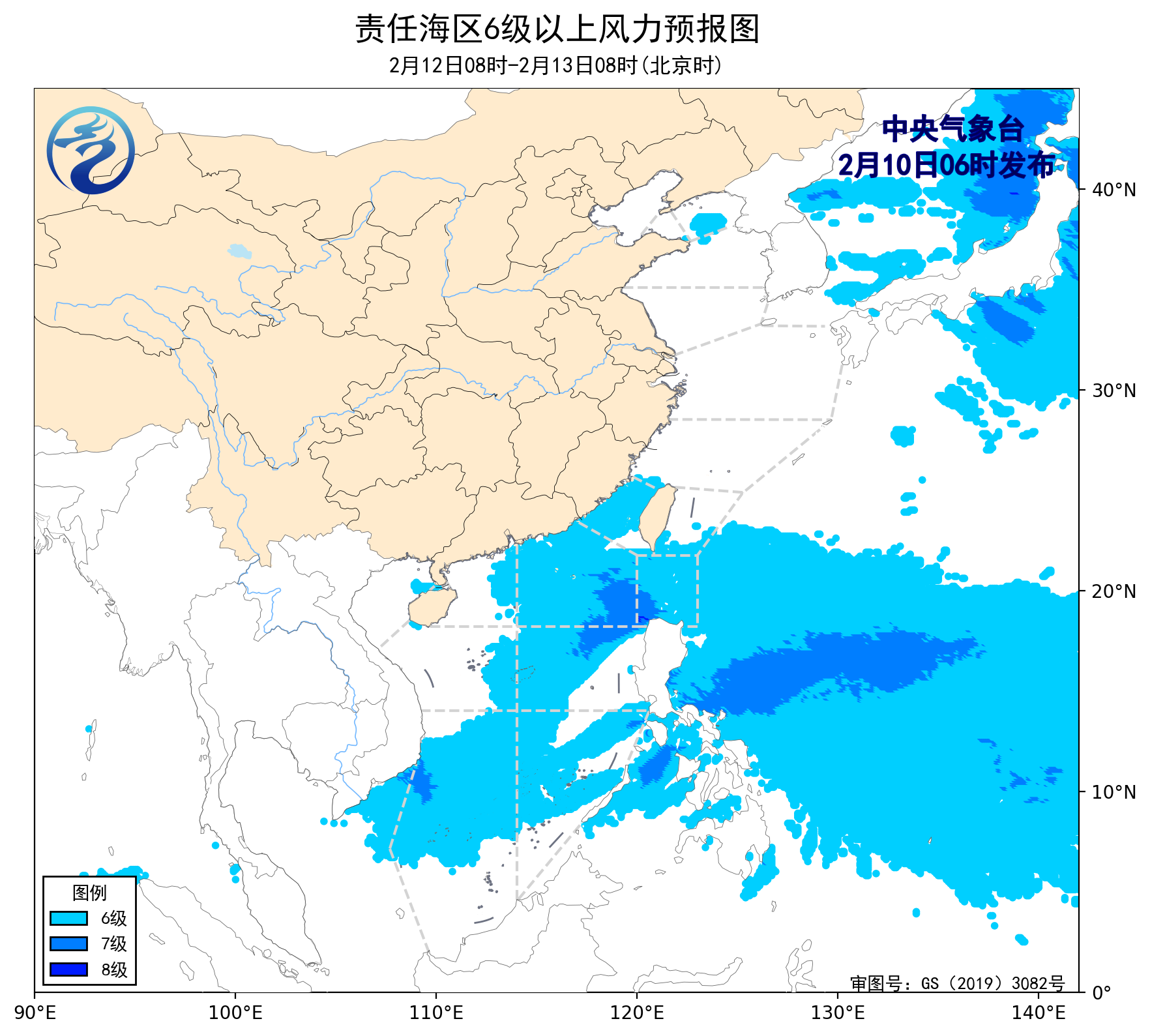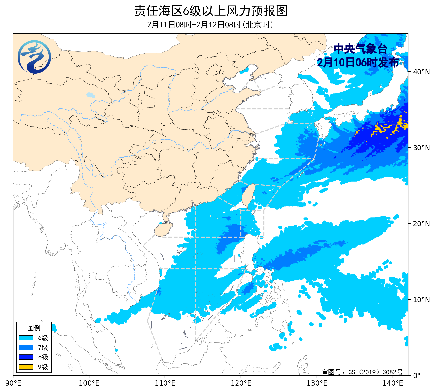 2月9日14时至10日02时,渤海、巴士海峡、南海北部海域、南海中西部海域、南海东南部海域出现了5~7级、阵风8级的东北风或偏东风,台湾海峡、南海西南部海域出现了5~7级、阵风8级的偏北风。