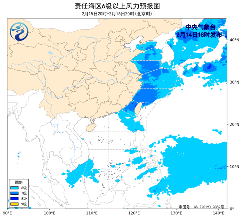 14日20时至15日20时,渤海、黄海中部海域将有5~7级、阵风8级的东北风到偏北风,巴士海峡将有5~6级、阵风7级的东南风到偏东风,东海北部海域将有4~6级、阵风7级的西北风到偏北风,渤海海峡、黄海北部和南部海域、南海西南部海域将有5~6级、阵风7级的偏北到东北风,南海东北部海域将有5~6级、阵风7级的偏东风。此外,2月14日夜间至15日早晨,黄海中部和南部、东海西北部和西南部、长江口附近海域、成山头、上海港、浙闽交界沿岸海域、北部湾北部海域、琼州海峡、雷州半岛东部附近海域、广东中西部沿海海域将有能见度不足1公里的大雾。