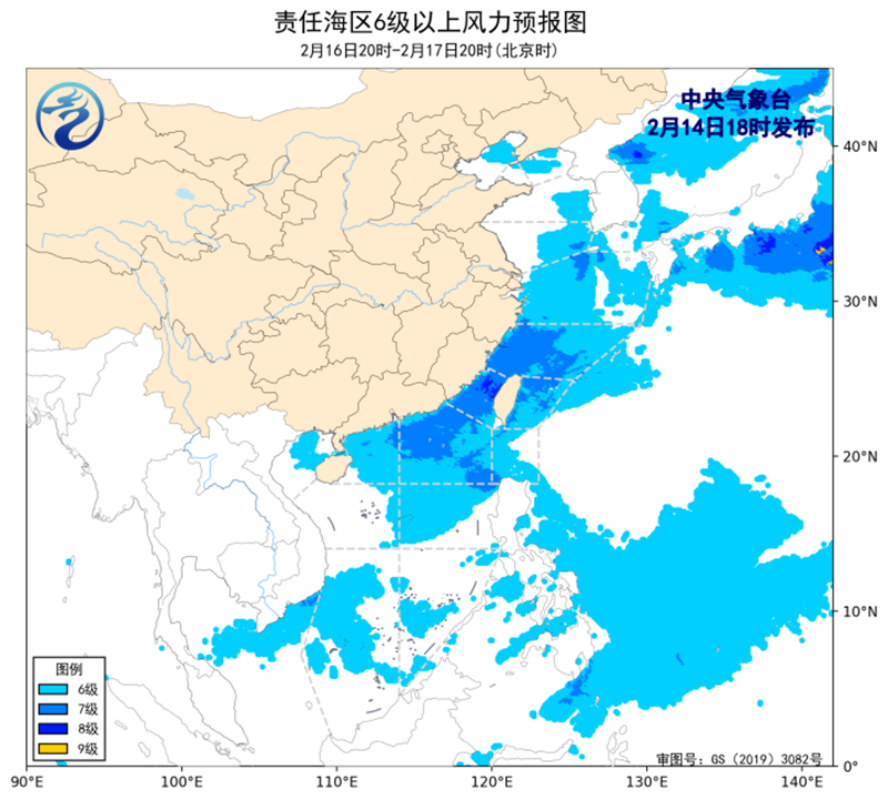预计,2月17日夜间至2月23日夜间,渤海、渤海海峡、北部湾、琼州海峡将有5~6级、阵风7级的风,黄海大部海域、台湾以东洋面将有6~7级、阵风8级的风,东海大部海域、南海大部海域将有6~8级、阵风9级的大风,台湾海峡、巴士海峡将有7~8级、阵风9级的大风。