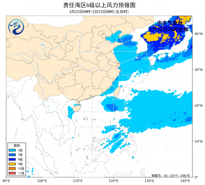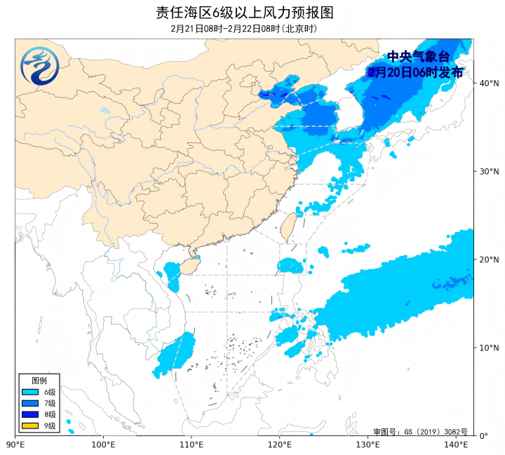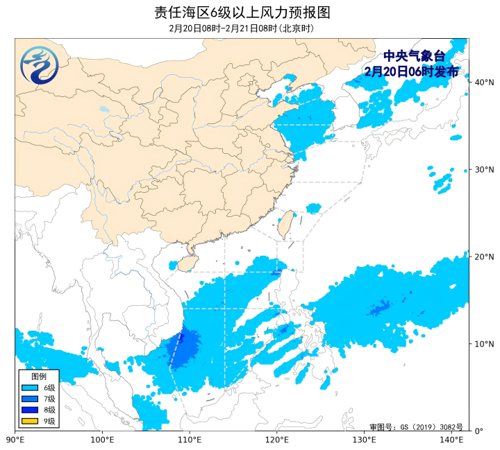 20日08时至21日08时,南海西南部海域将有6~7级、阵风8级的东北风,渤海海峡、黄海大部海域将有4~6级、阵风7级的偏南风,巴士海峡、南海东部和中西部海域将有4~6级、阵风7级的偏东到东北风。
