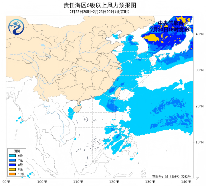 2月20日02时至14时,渤海出现了5~6级、阵风7级的偏南风,东海南部海域、南海西南部海域出现了5~7级、阵风8级的偏北风,巴士海峡、南海东北部海域、南海中西部海域、南海东南部海域出现了5~6级、阵风7级的东北风或偏东风。黄海北部海域出现了能见度不足1公里的大雾。