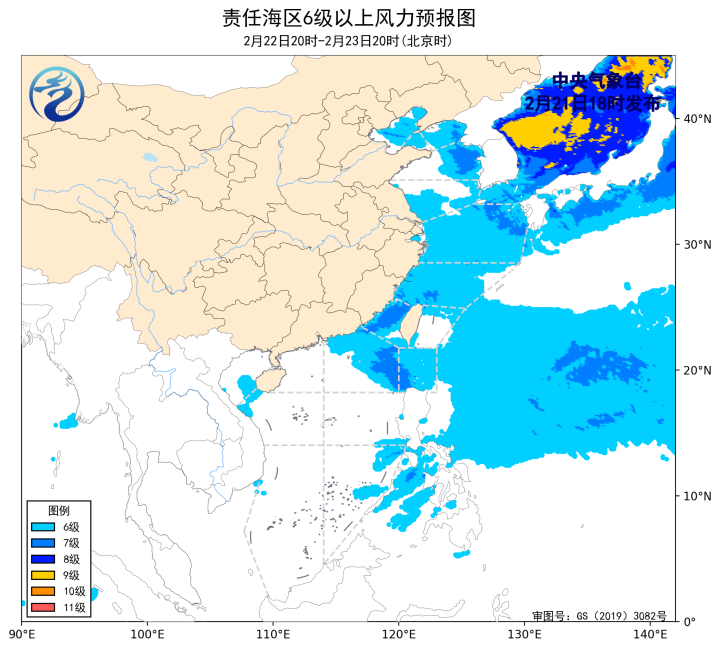 2月21日02时至14时,渤海、南海西南部海域出现了5~6级、阵风7级的东北风或偏北风,黄海大部海域出现了5~6级、阵风7级的偏南风。