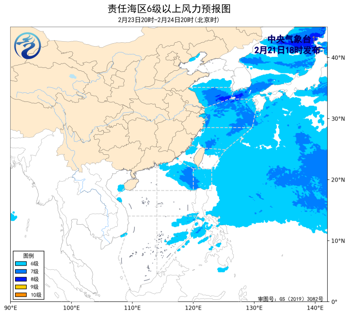预计,2月24日夜间至28日白天,黄海南部海域、东海大部海域、台湾海峡、巴士海峡、台湾以东洋面、南海东北部海域将有6~7级、阵风8级的风。