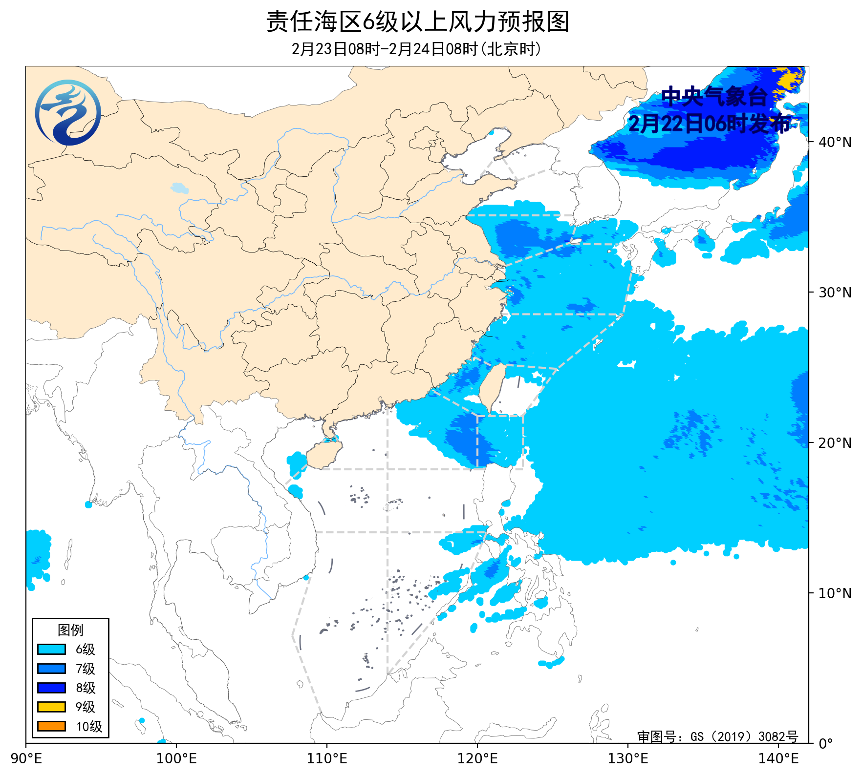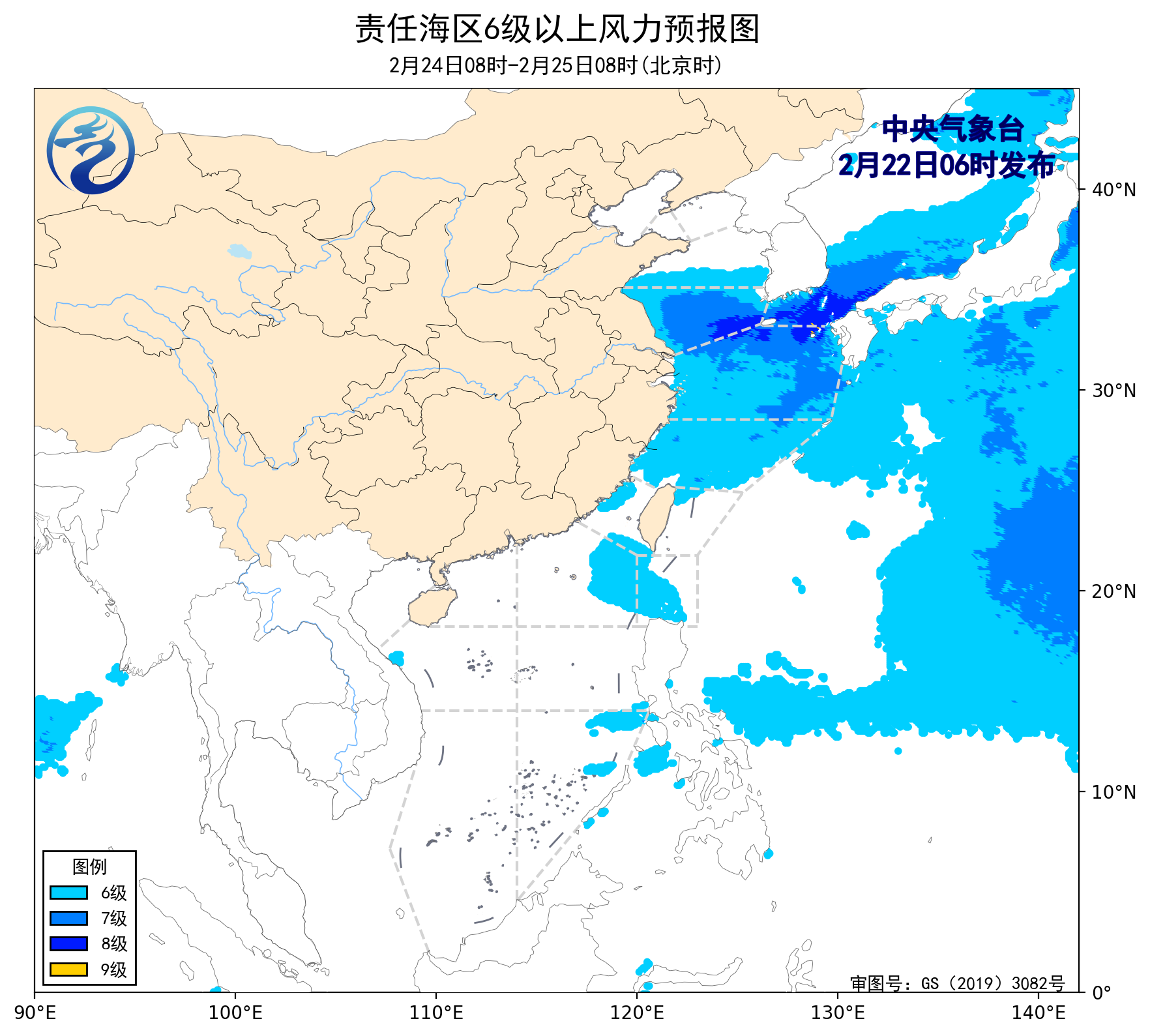 24日08时至25日08时,黄海南部海域将有6~8级、阵风9级的东北风,东海北部海域将有6~7级、阵风8级的东北风,黄海中部海域将有5~6级、阵风7级的偏东到东北风,东海南部海域将有5~6级、阵风7级的偏南转偏北风,台湾海峡将有5~6级、阵风7级的东南风转东北风,巴士海峡将有4~6级、阵风7级的偏东到东南风,南海东北部海域将有5~6级、阵风7级减弱到4级以下的东南风。