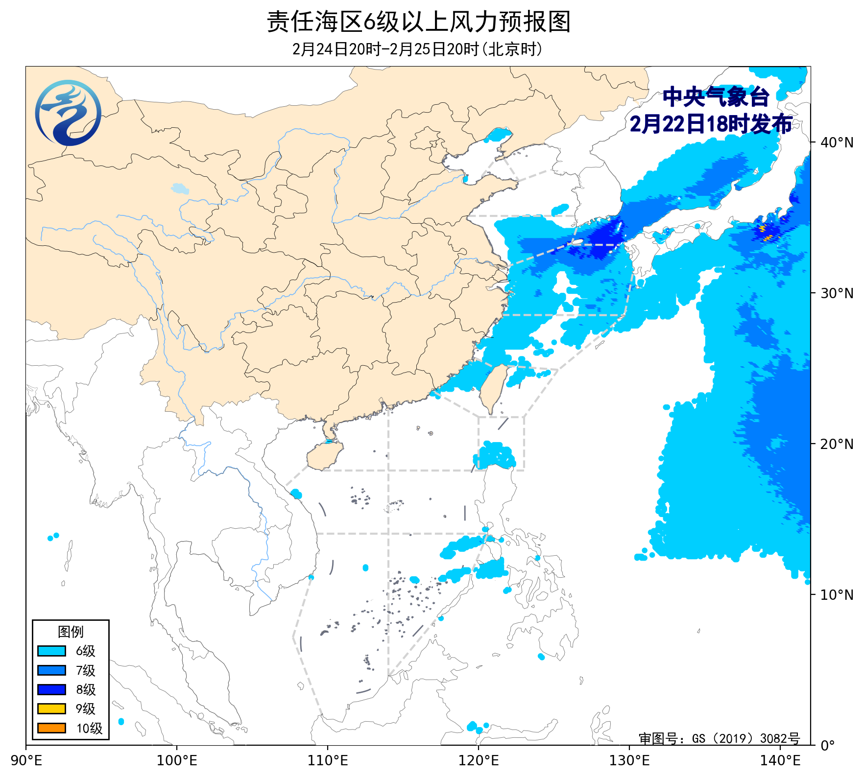 预计,2月25日夜间至3月1日夜间,渤海、台湾海峡、南海大部海域将有6~7级、阵风8级的风,渤海海峡、台湾以东洋面、巴士海峡、北部湾、琼州海峡将有5~6级、阵风7级的风,黄海中部和南部海域将有8~9级、阵风10级减弱至6~7级、阵风8级的风,东海大部海域将有6~8级、阵风9级的大风。