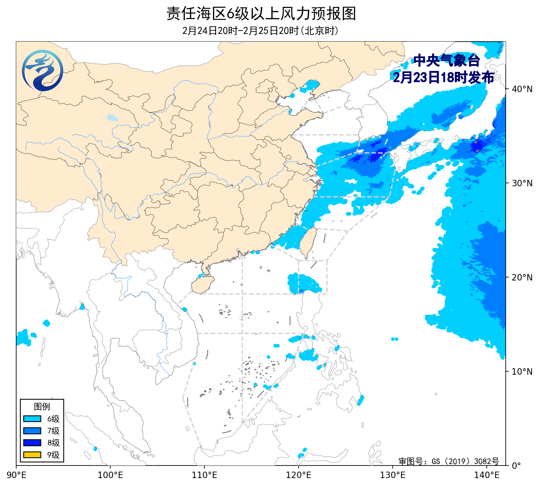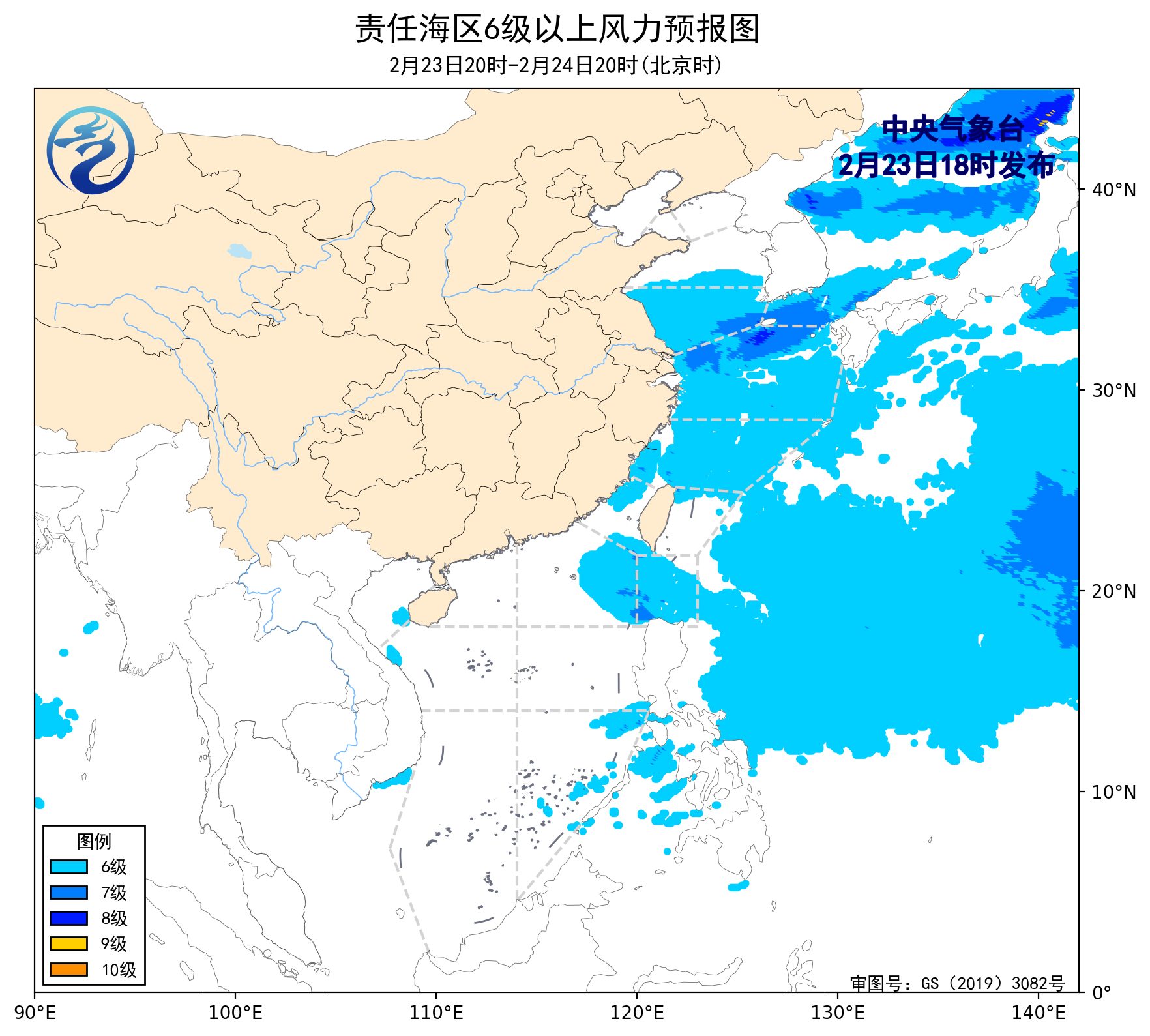 2月23日02时至14时,东海大部海域、南海东北部海域出现了6~7级、阵风8级的大风,其中东海西北部的部分海域出现8级、阵风9级的东北风。