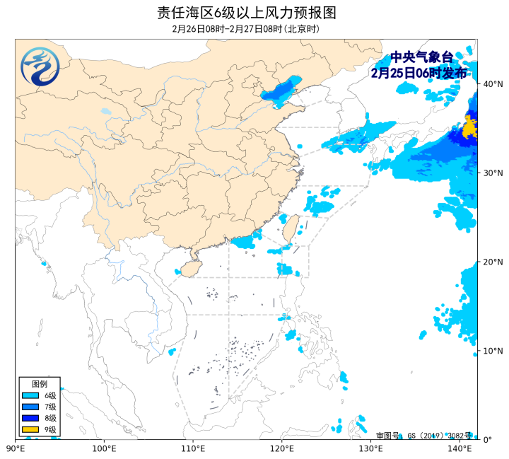 2月24日14时至25日02时,黄海南部海域、东海大部海域出现了5~7级、阵风8级的偏北风或东北风。琼州海峡出现了能见度不足1公里的大雾。