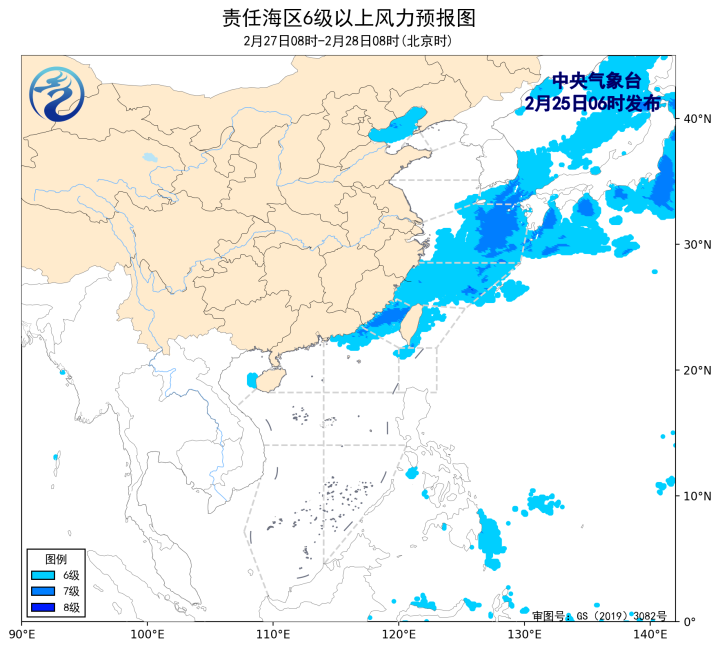 27日08时至28日08时,东海北部海域、台湾海峡将有5~7级、阵风8级的东北风,南海东北部海域将有4级以下的东南风增大到5~6级、阵风7级的东北风,渤海、东海南部海域、台湾以东洋面将有5~6级、阵风7级的偏北到东北风。