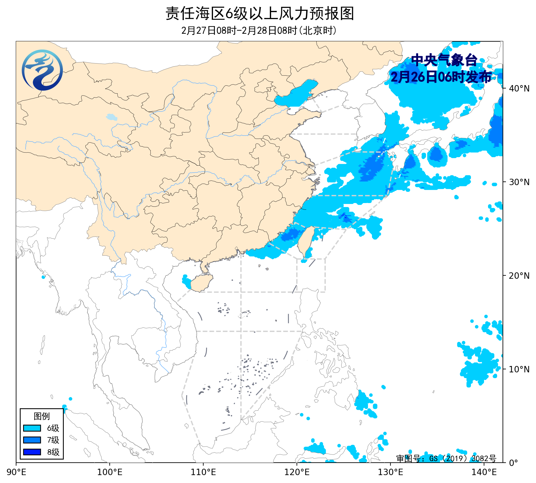2月25日14时至26日02时,东海北部海域、台湾以东洋面、巴士海峡、南海东北部海域出现了5~7级、阵风8级的东北风或偏东风。