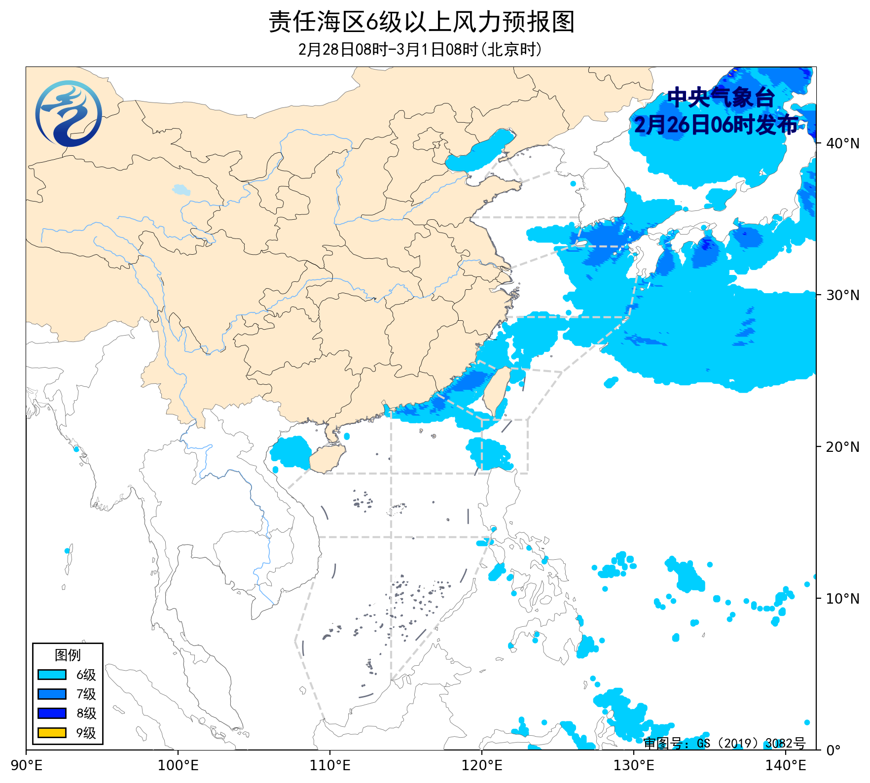 2月28日08时至3月1日08时,台湾海峡将有5~7级、阵风8级的东北风,北部湾将有4~6级、阵风7级的东南风到偏南风,渤海、黄海南部海域、东海大部海域、巴士海峡、南海东北部海域将有4~6级、阵风7级的偏东到东北风。