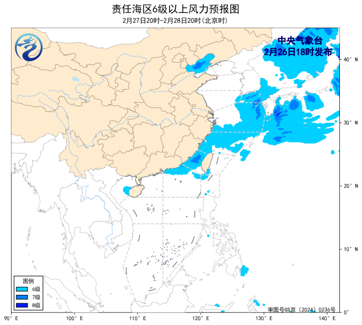 26日20时至27日20时,东海南部海域将有4~6级、阵风7级的西北风转东北风,渤海、东海北部海域将有4~6级、阵风7级的偏北到东北风。