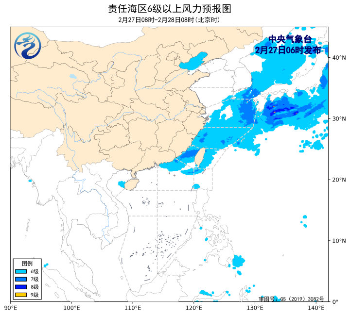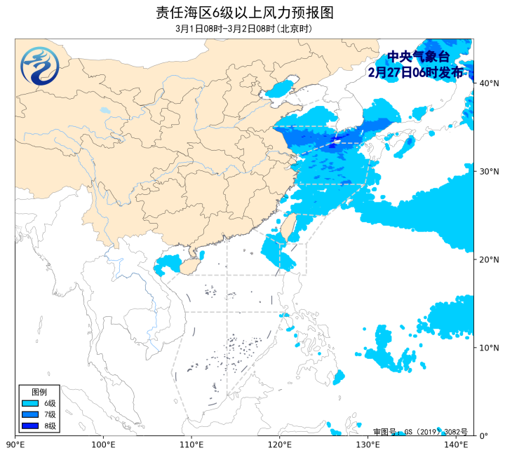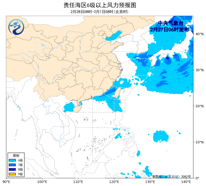2月28日08时至3月1日08时,台湾海峡将有5~7级、阵风8级的东北风,东海南部海域将有5~6级、阵风7级的东北风转东南风,北部湾将有5~6级、阵风7级的偏南风,渤海、黄海南部海域、东海北部海域、巴士海峡、南海东北部海域将有4~6级、阵风7级的偏东到东北风。