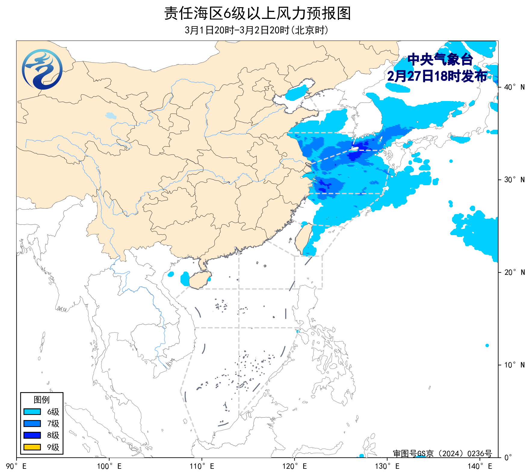 预计,3月2日夜间至3月6日白天,渤海、渤海海峡、琼州海峡将有5~6级、阵风7级的风,黄海大部海域、东海大部海域、台湾以东洋面将有6~8级、阵风9级的大风,台湾海峡将有7~8级、阵风9级的大风,巴士海峡、北部湾、南海大部海域将有6~7级、阵风8级的风。