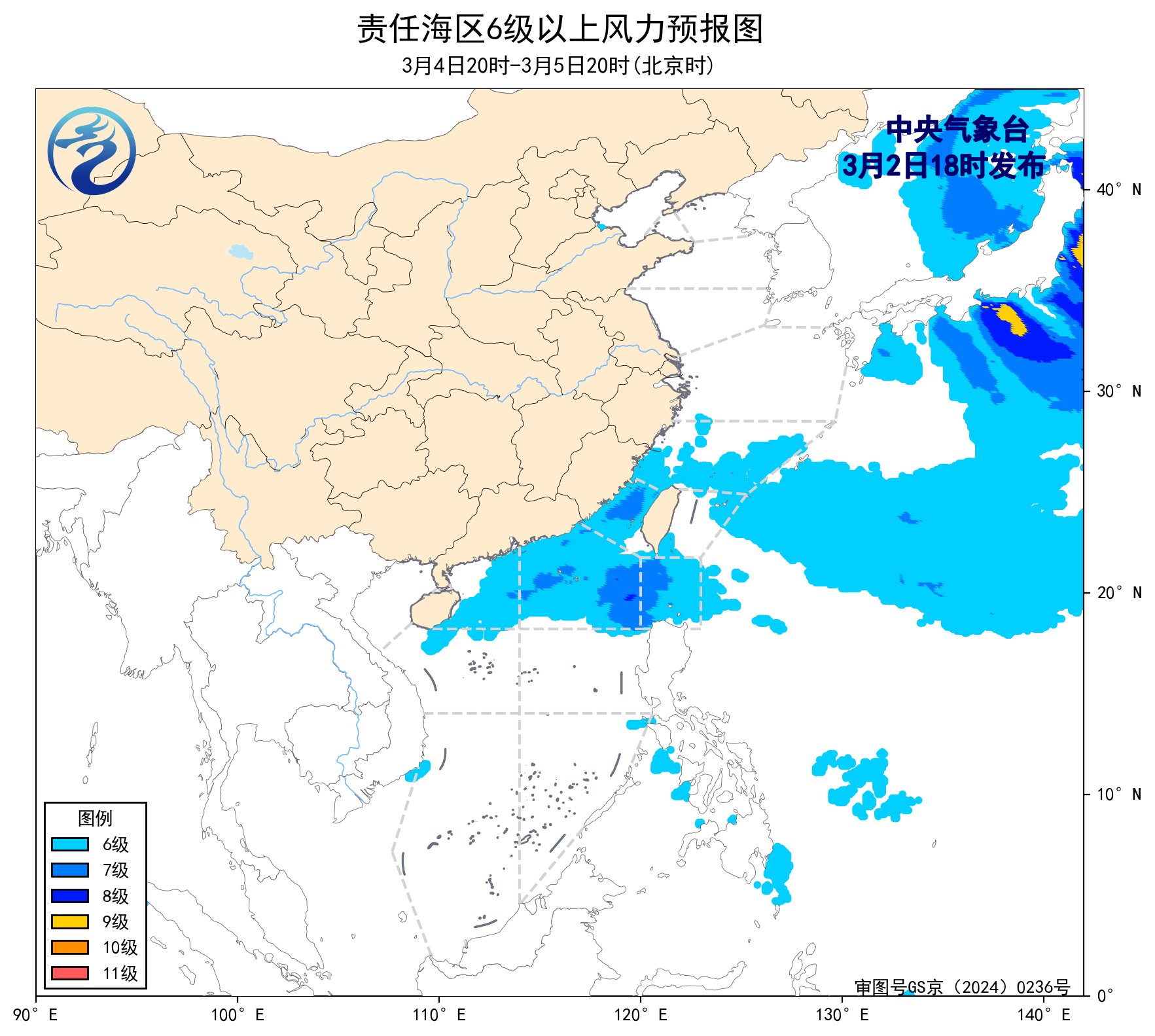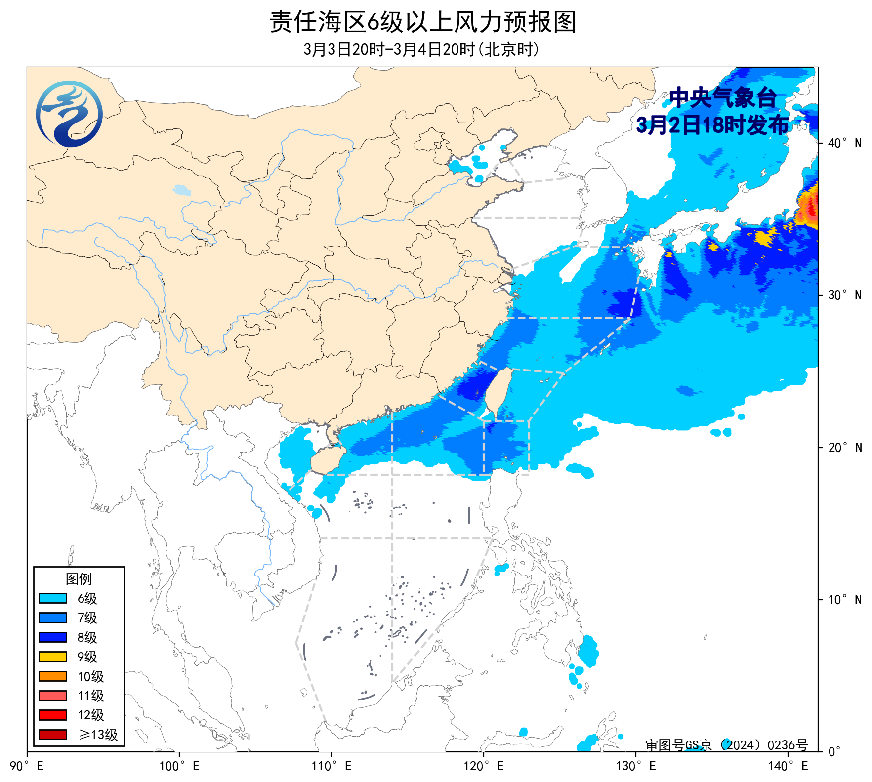 2日20时至3日20时,东海北部海域、台湾海峡将有6~8级、阵风9级的偏北到东北风,南海东北部海域将有4~5级增大到6~7级、阵风8级的东北风,黄海南部海域、东海南部海域、台湾以东洋面、巴士海峡将有5~7级、阵风8级的偏北到东北风,黄海中部海域、北部湾、南海西北部海域将有4~6级、阵风7级的东北风,琼州海峡将有4级以下增大到5~6级、阵风7级的东北风。