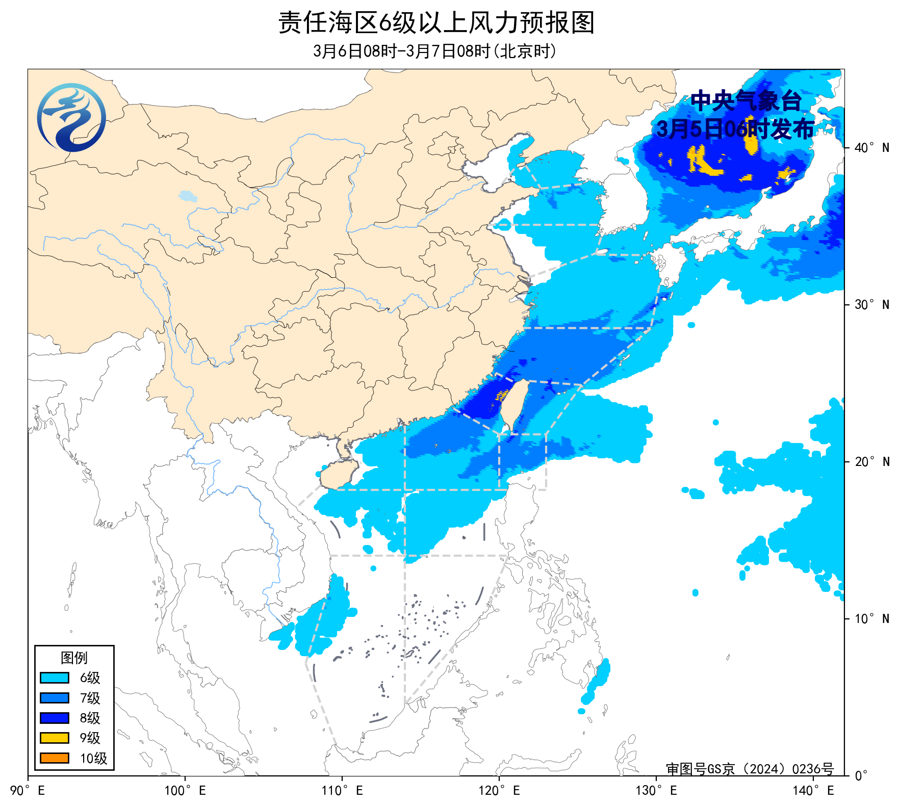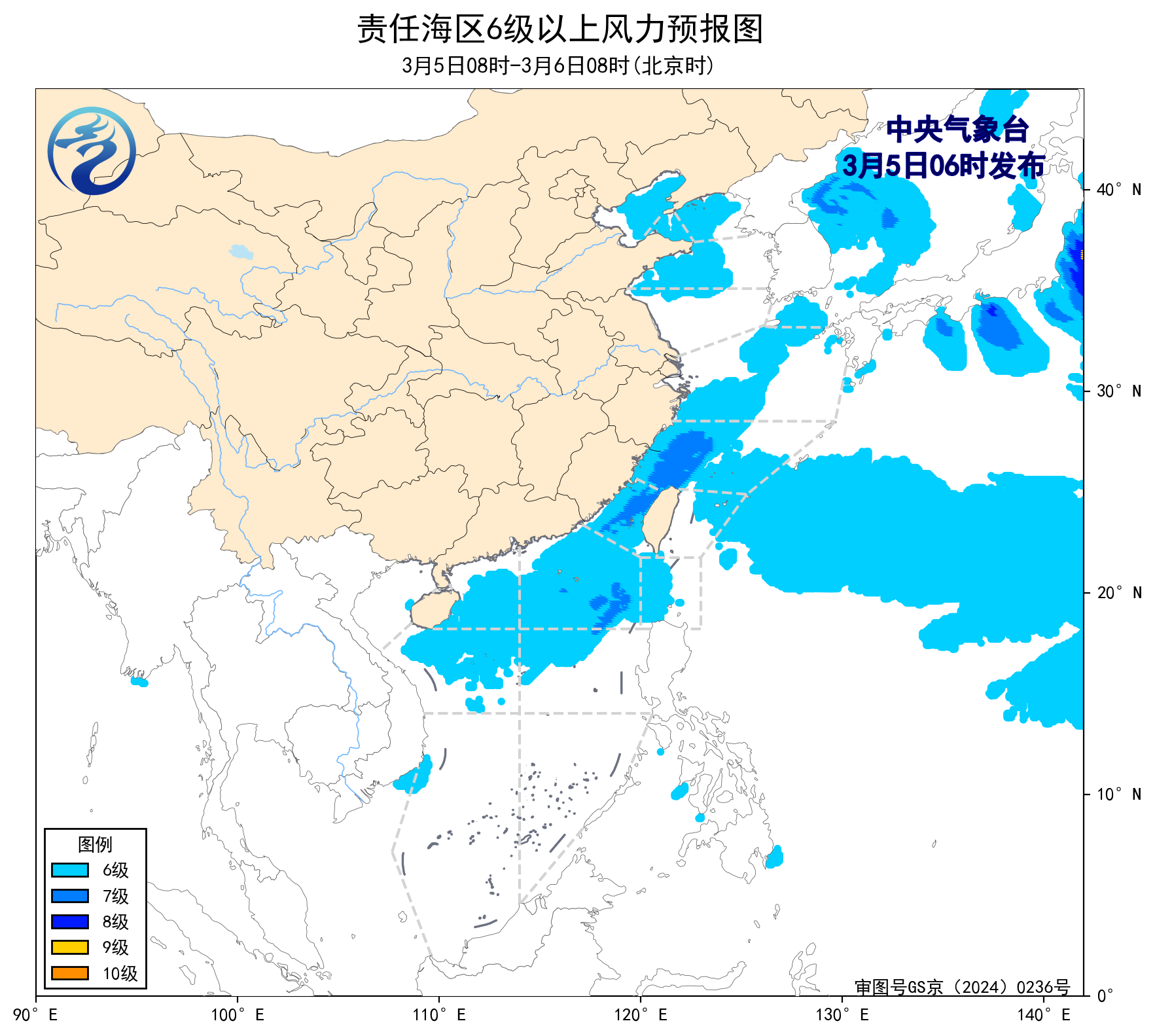 5日08时至6日08时,东海南部海域将有5~7级、阵风8级的东南风转偏北风,台湾海峡、南海东北部海域将有5~7级、阵风8级的偏北到东北风,渤海海峡将有4级以下的偏东风增大到5~6级、阵风7级的偏北风,黄海北部海域将有4级以下的东北风增大到5~6级、阵风7级的西北风,黄海中部海域将有4级以下的偏北风增大到5~6级、阵风7级的西北风,黄海南部海域将有4级以下增大到5~6级、阵风7级的偏北风,东海北部海域将有4~6级、阵风7级的偏东转偏北风,渤海、南海西北部和中部海域将有4~6级、阵风7级的偏北到东北风,巴士海峡将有4~6级、阵风7级的偏东风。