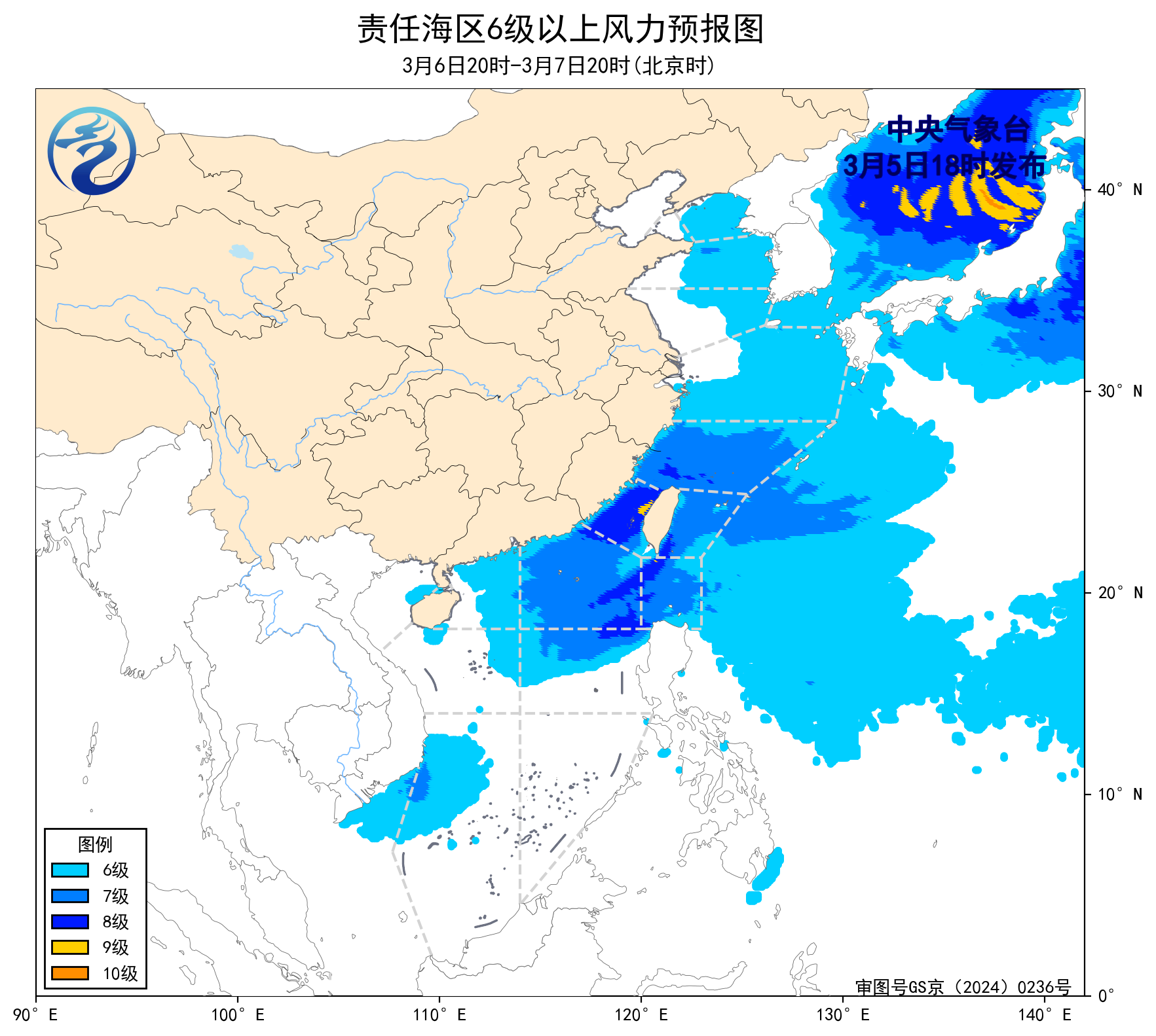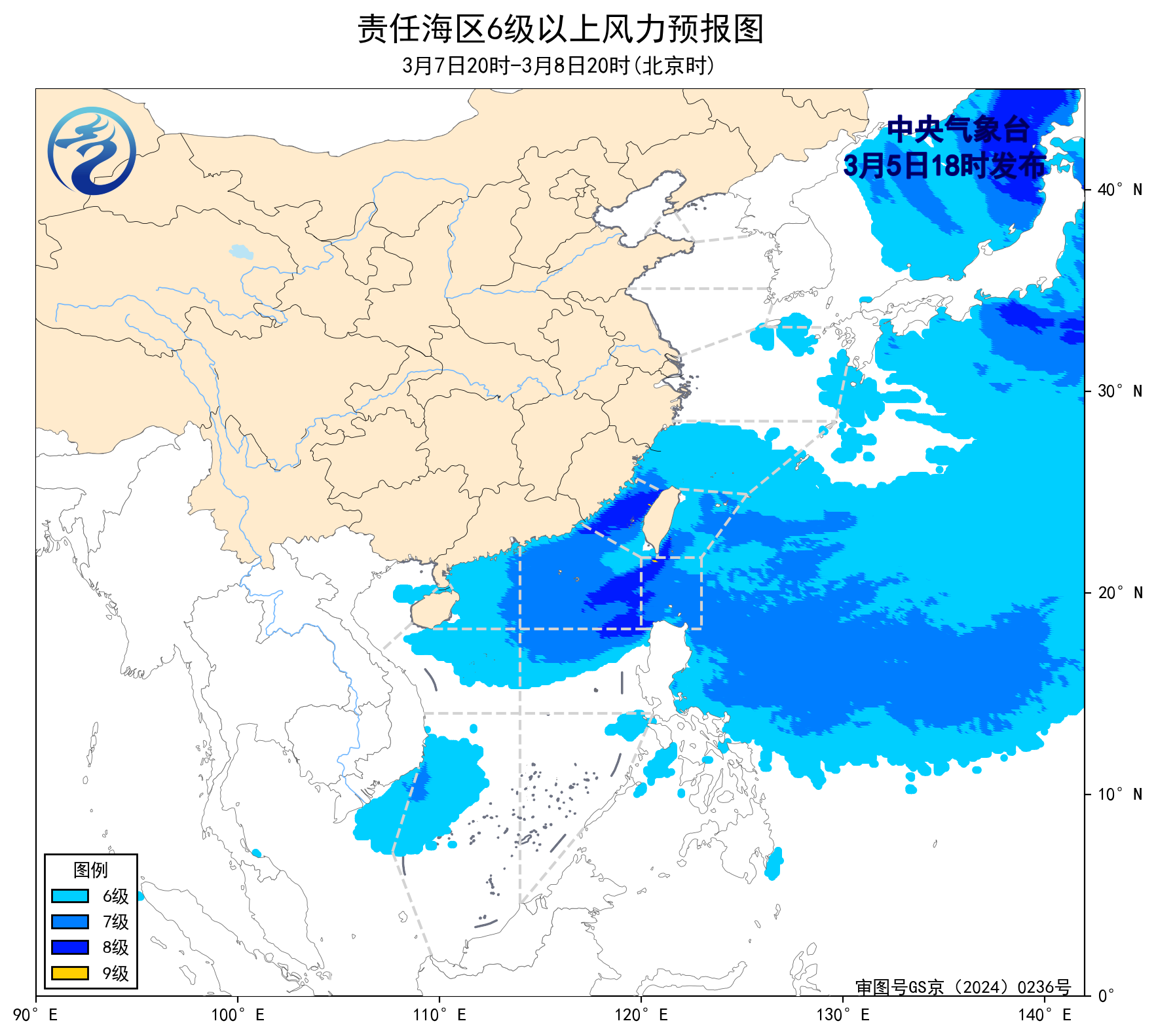 预计,3月8日夜间至3月12日白天,东海大部海域、台湾海峡、巴士海峡、台湾以东洋面、南海大部海域、北部湾将有6~7级、阵风8级的风,其中台湾海峡和南海东北部的部分海域风力可达8级、阵风9~10级的大风。