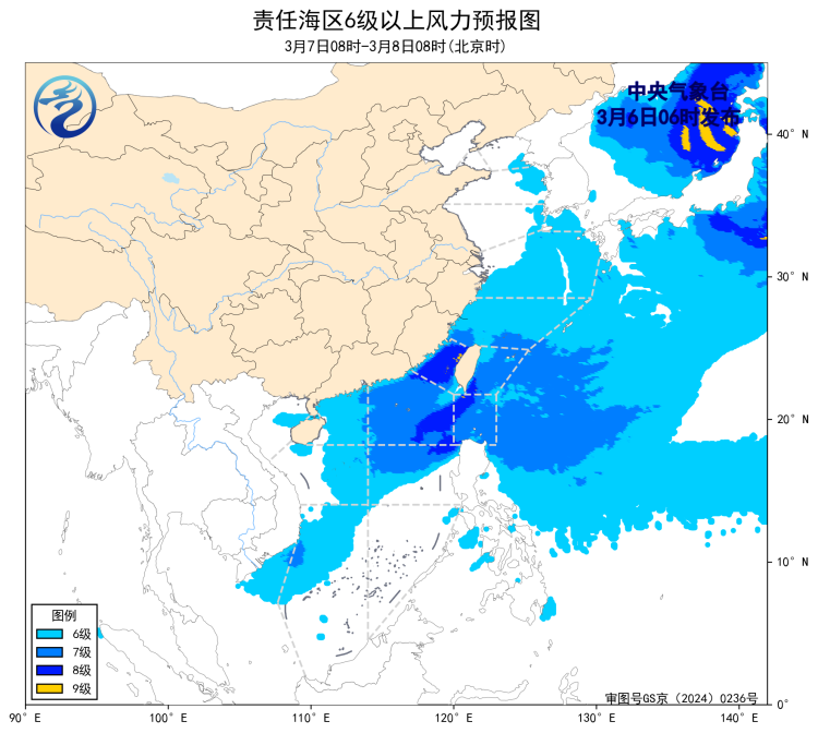 6日08时至7日08时,台湾海峡将有7~8级、阵风9级的东北风,东海南部海域、台湾以东洋面、巴士海峡、南海东北部海域将有5~7级、阵风8级的东北风,渤海海峡、黄海大部海域、东海北部海域将有4~6级、阵风7级的偏北到西北风,南海西北部和中西部海域将有4~6级、阵风7级的东北风。