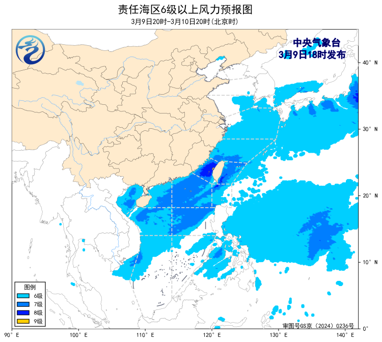 3月9日02时至14时,黄海大部海域、东海北部海域、台湾海峡出现了5~7级、阵风8级的偏北风或西北风,东海南部海域、台湾以东洋面、巴士海峡、南海北部海域、北部湾、南海中部海域、南海东南部海域出现了5~7级、阵风8级的东北风或偏东风。