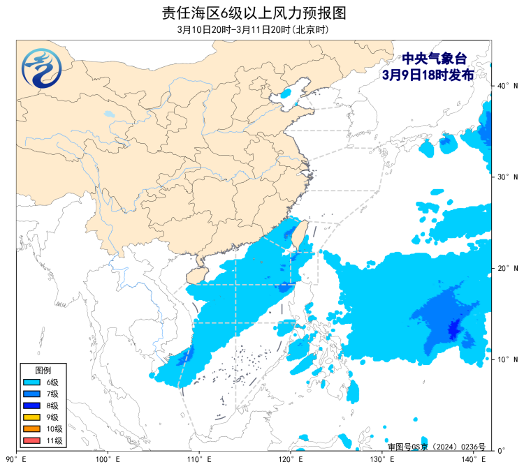 11日20时至12日20时,东海大部海域、台湾海峡、台湾以东洋面、巴士海峡、南海东北部海域将有6~7级、阵风8级的偏北到东北风,南海西部和中东部海域将有5~6级、阵风7级的东北风。