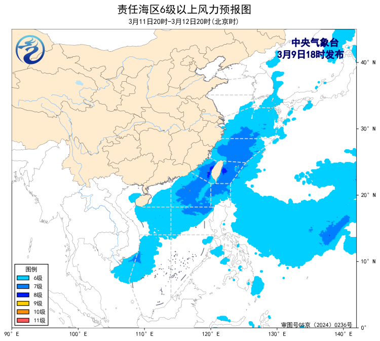 预计,3月12日夜间至16日白天,渤海、琼州海峡将有5~6级、阵风7级的风,东海大部海域、台湾以东洋面、南海大部海域将有6~8级、阵风9级的大风,台湾海峡将有8~9级、阵风10级减弱至6~7级、阵风8级的风,巴士海峡将有7~8级、阵风9级的大风,北部湾将有6~7级、阵风8级的风。