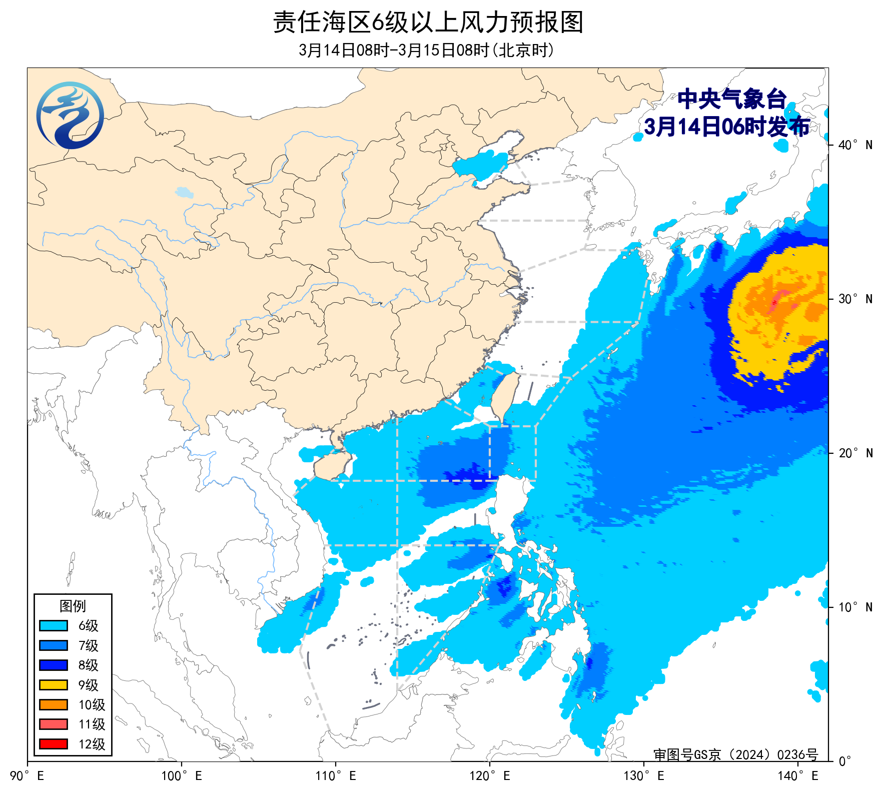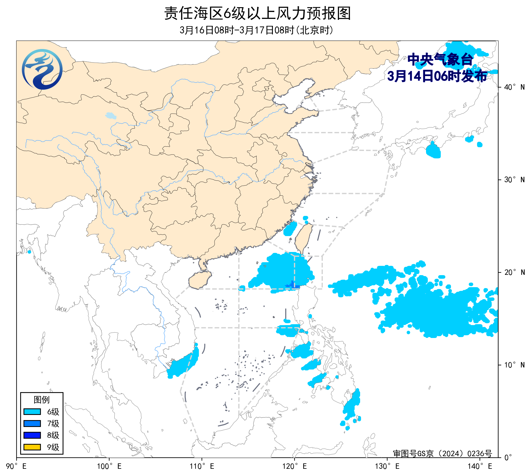 15日08时至16日08时,台湾海峡、南海中东部海域将有5~6级、阵风7级的偏北到东北风,巴士海峡、南海北部和东南部海域将有5~6级、阵风7级的偏东风。
