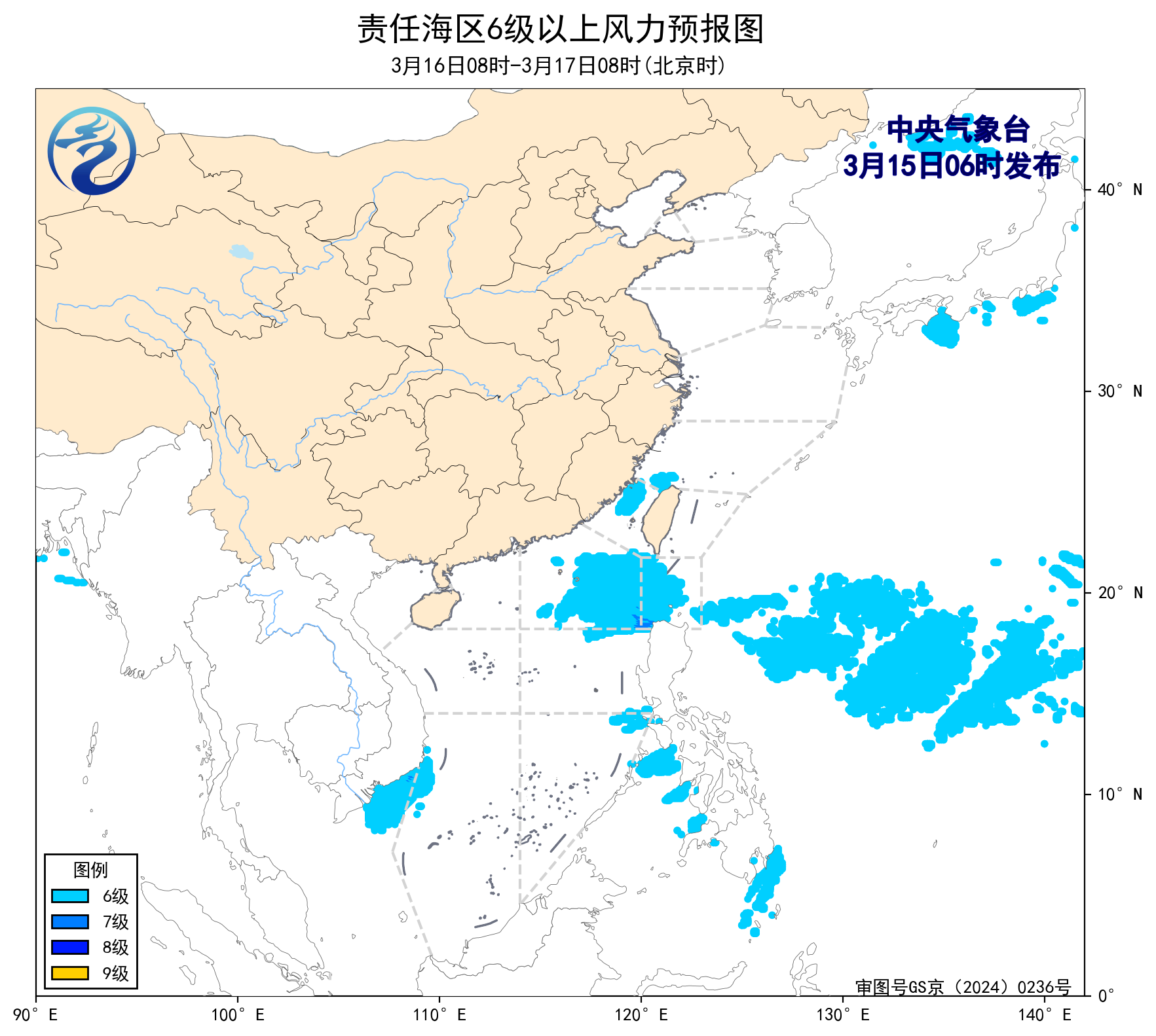 16日08时至17日08时,巴士海峡、南海东北部海域将有5~6级、阵风7级的偏东风。