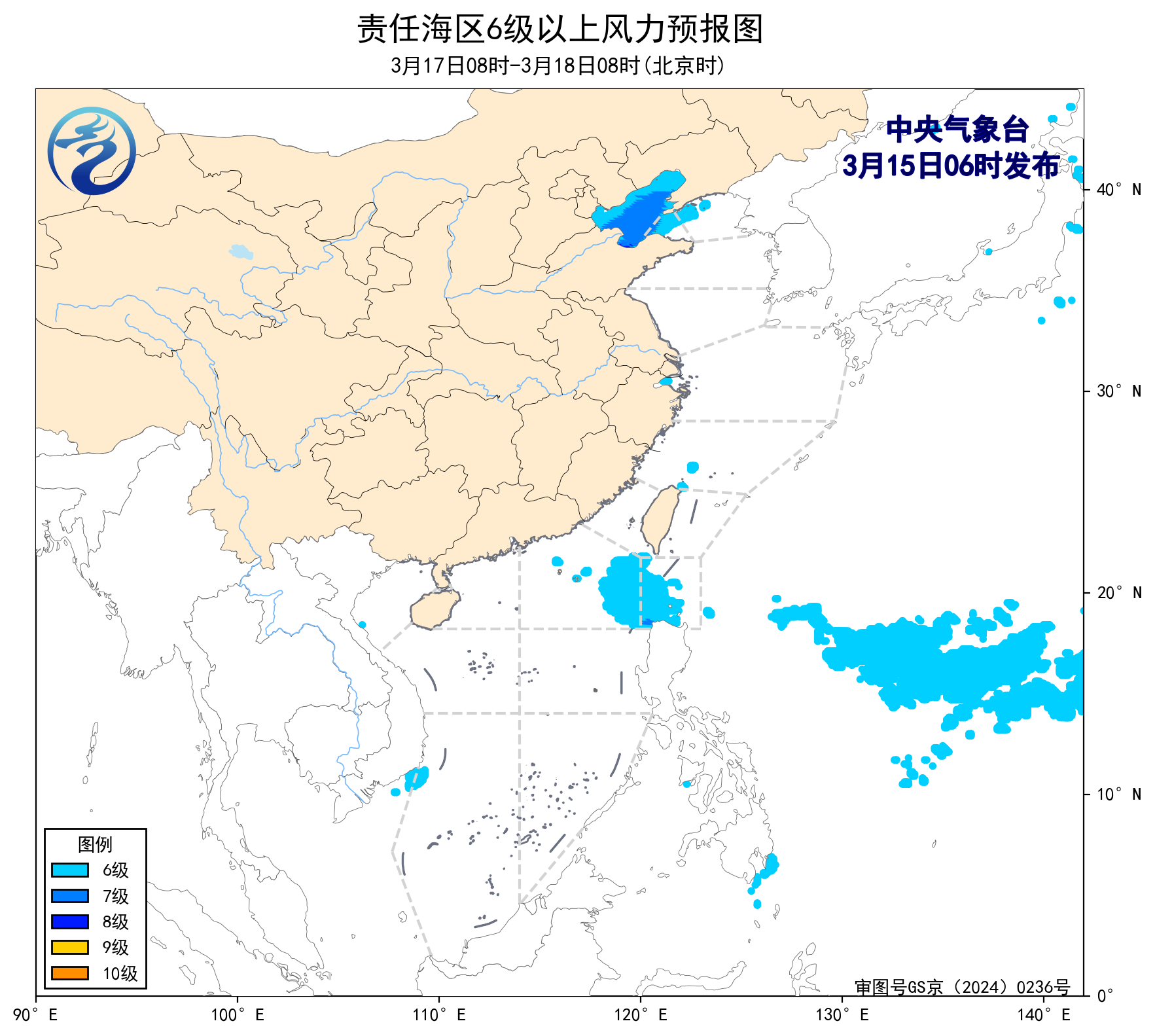 17日08时至18日08时,渤海将有6~7级、阵风8级的东北风,渤海海峡、黄海北部海域将有5~6级、阵风7级的偏北风,巴士海峡、南海东北部海域将有5~6级、阵风7级的偏东风。