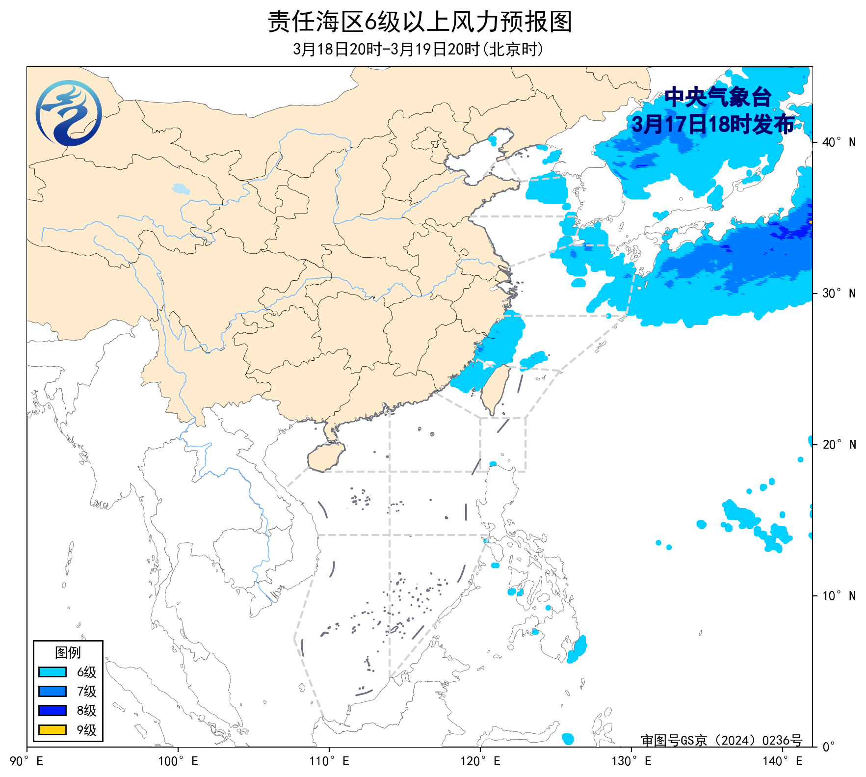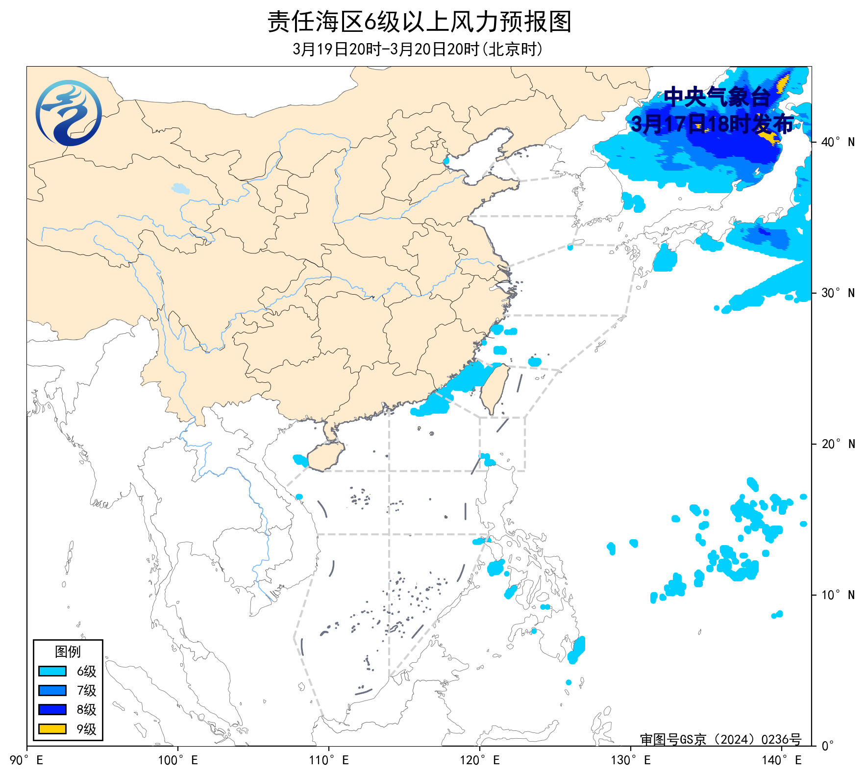预计,3月20日夜间至24日白天,渤海、黄海南部海域、台湾海峡、台湾以东洋面、巴士海峡、北部湾、南海大部海域将有5~6级、阵风7级的风,东海大部海域将有6~7级、阵风8级的风。