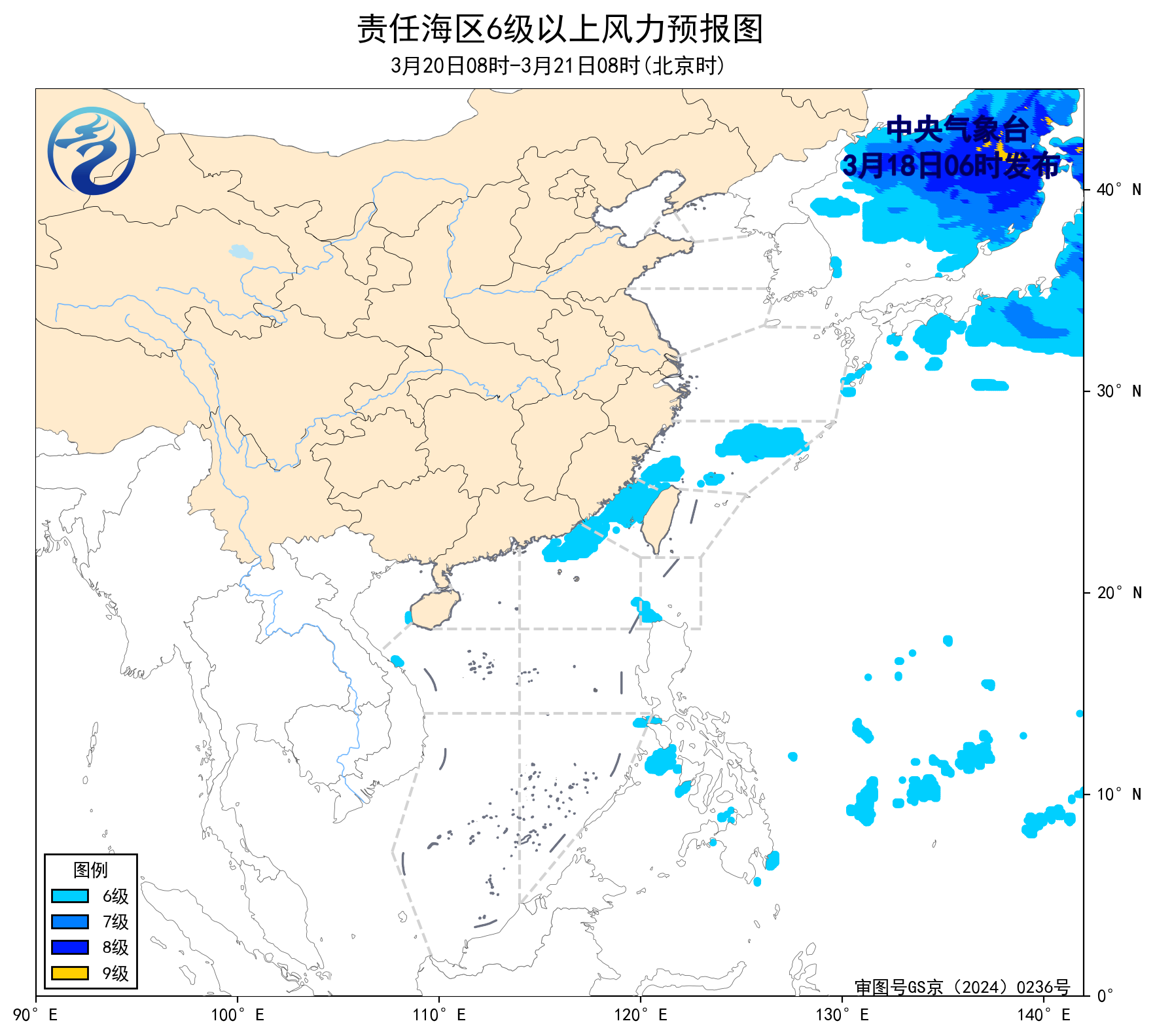 3月17日14时至18日02时,巴士海峡、南海东北部海域出现了5~6级、阵风7级的偏东风。