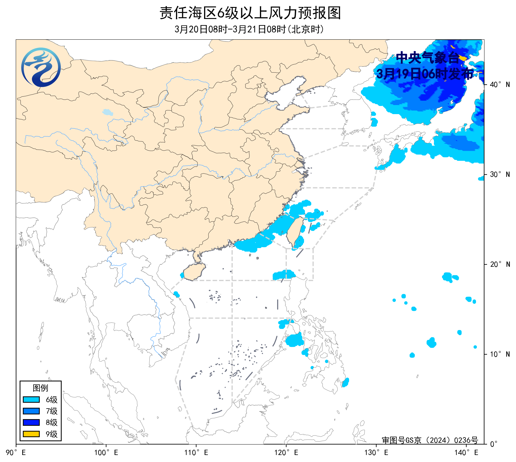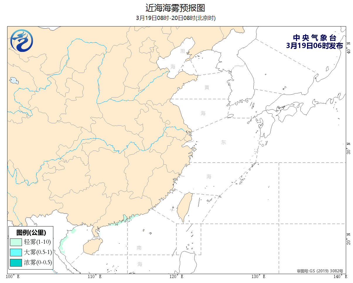 19日08时至20日08时,东海南部海域、台湾海峡、台湾以东洋面将有5~6级、阵风7级的东北风。广东中部沿岸海域,北部湾西部海域将有轻雾。