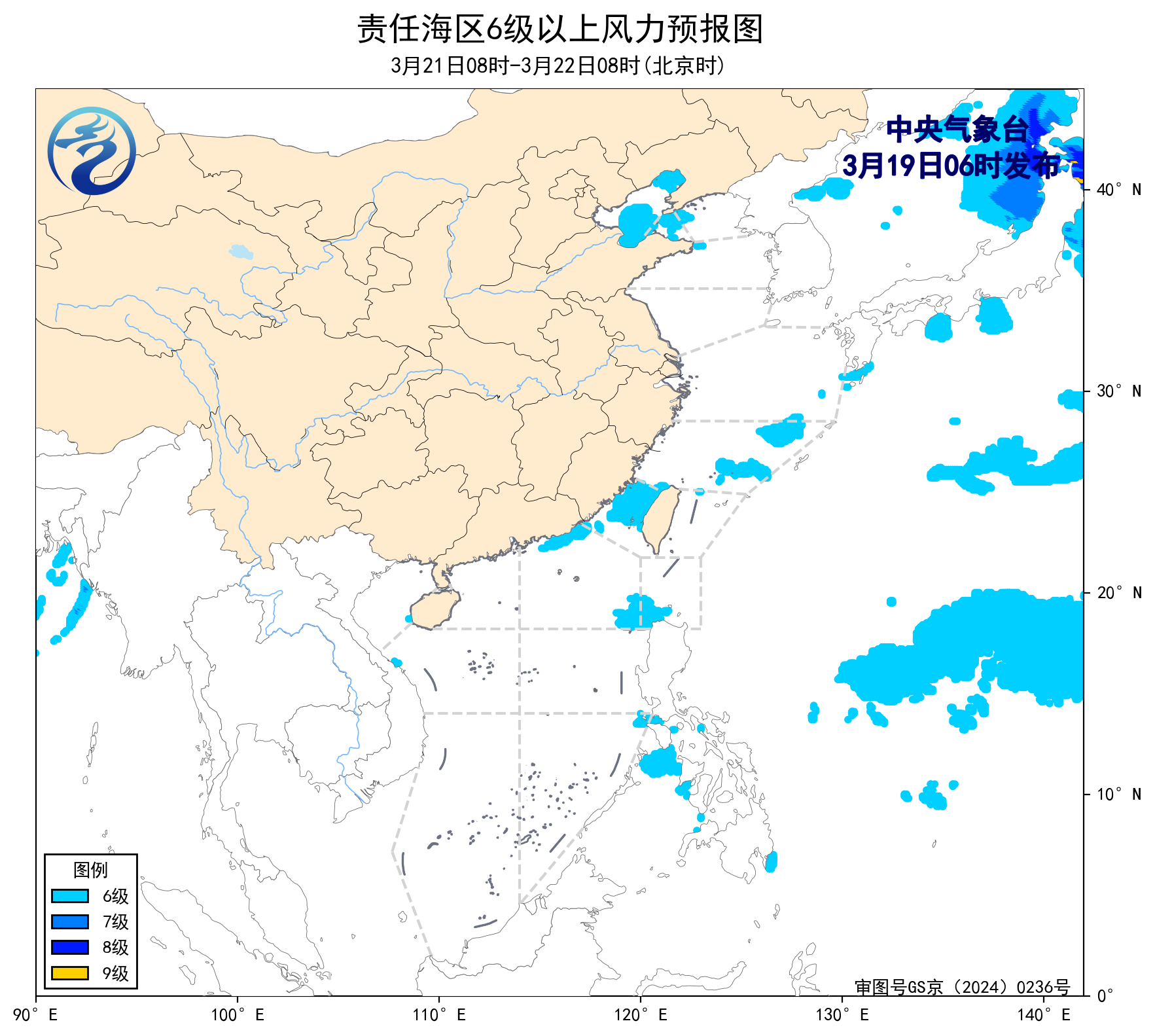 21日08时至22日08时,渤海、渤海海峡将有5~6级、阵风7级的偏南风,台湾海峡将有5~6级、阵风7级的东北风。