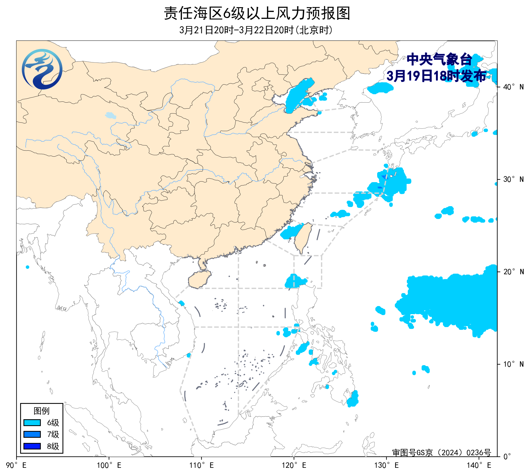 预计,3月22日夜间至26日白天,渤海、东海大部海域将有6~7级、阵风8级的风,渤海海峡、黄海北部海域、巴士海峡、南海东北部海域、南海中西部海域、南海东南部海域将有5~6级、阵风7级的风。