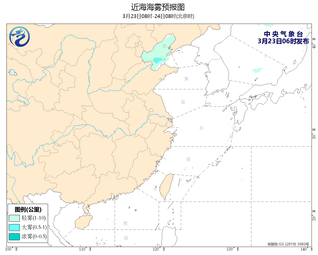3月22日14时至23日02时,东海北部海域出现了5~6级、阵风7级的偏北风。渤海、黄海北部海域出现了能见度不足1公里的大雾。