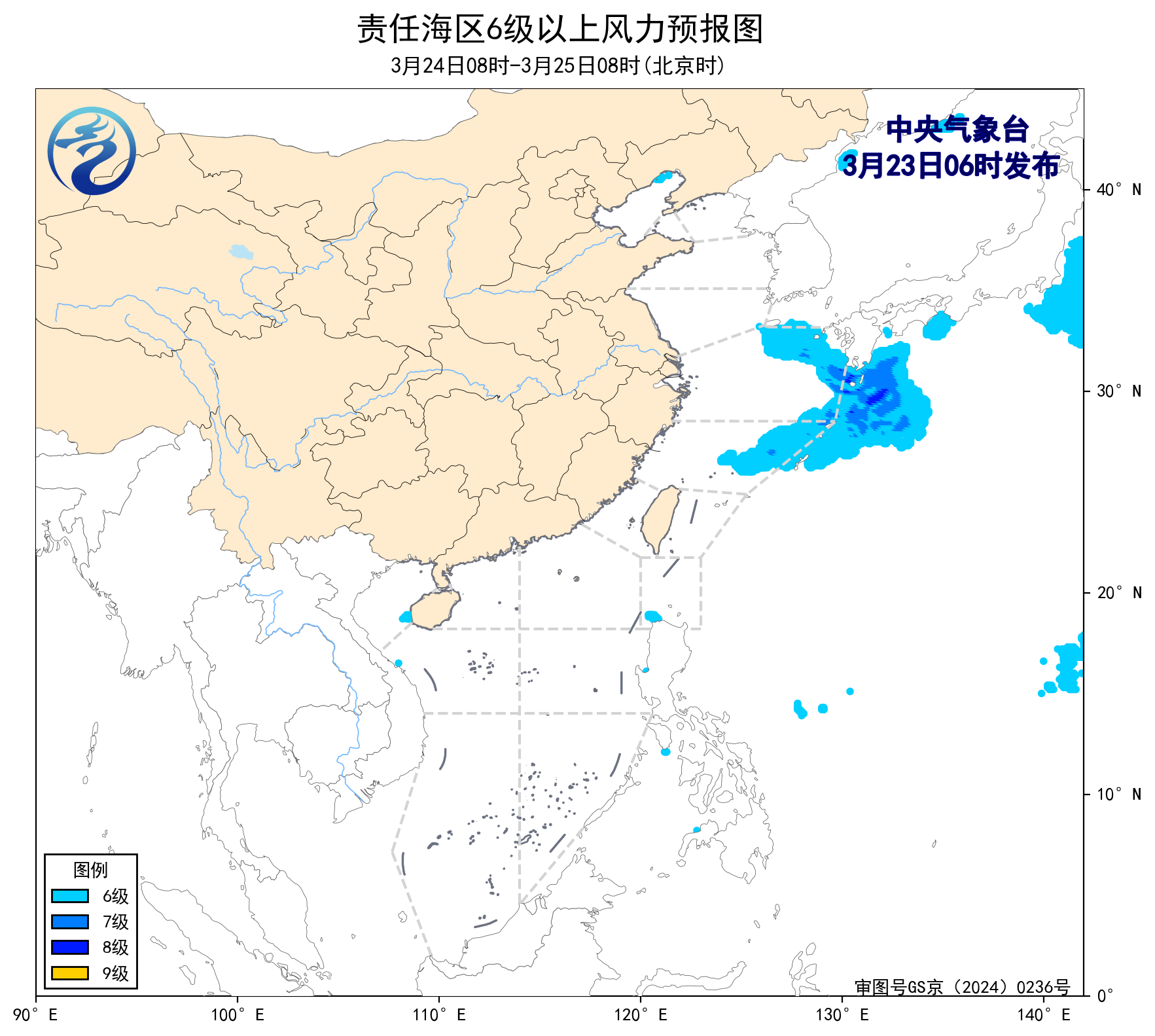24日08时至25日08时,东海北部海域将有5~6级、阵风7级的东北风,东海南部海域将有5~6级、阵风7级的西南风。