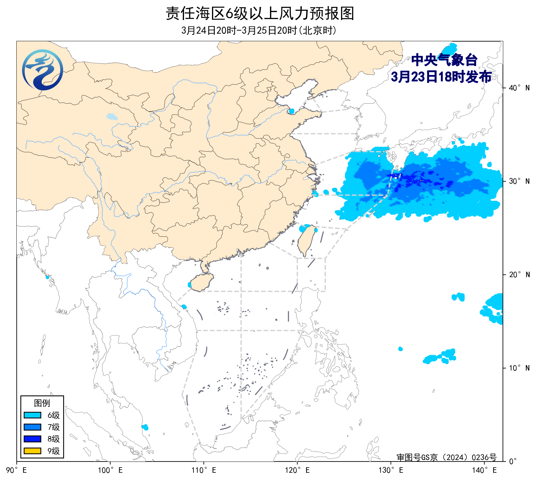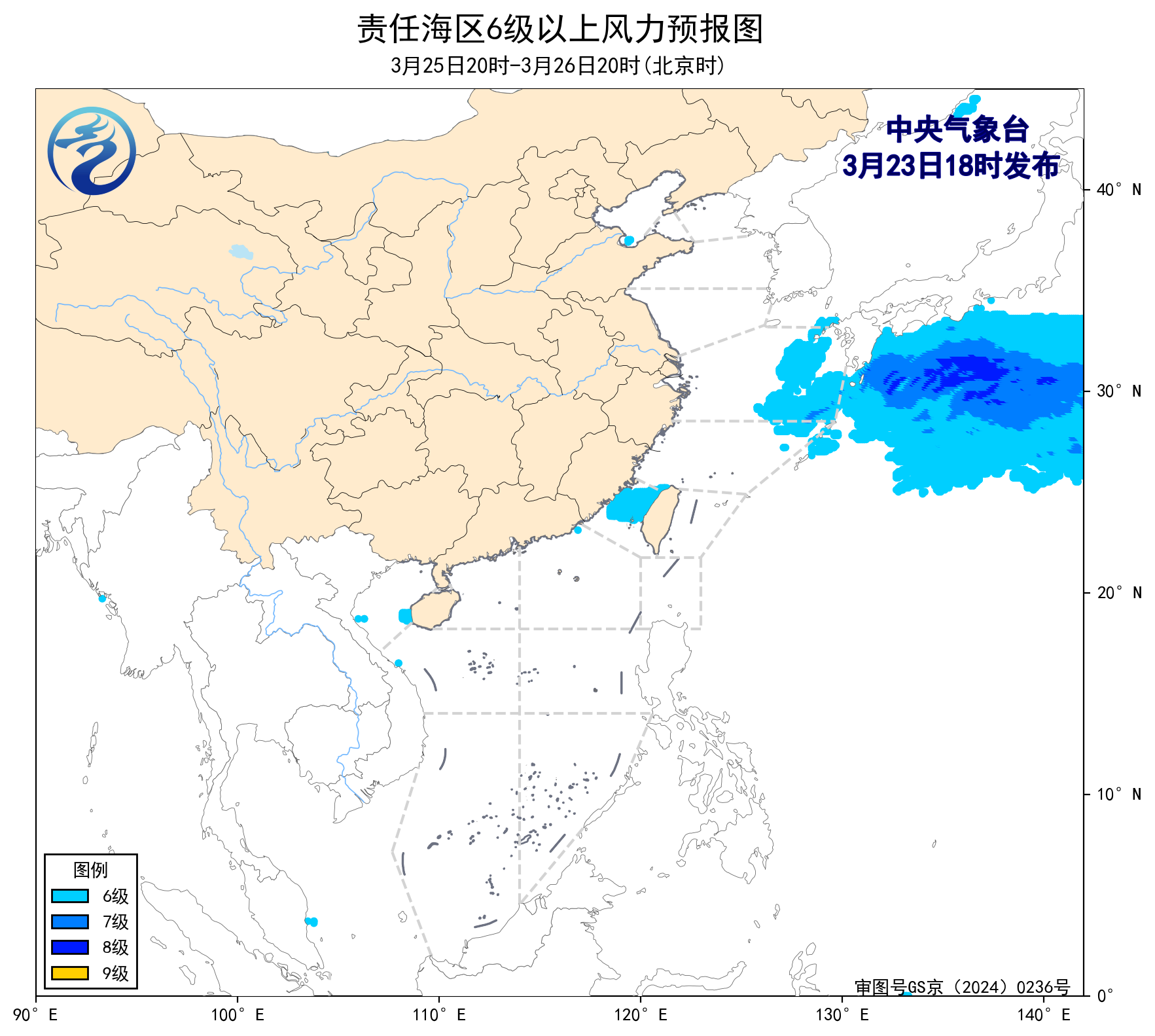 预计,3月26日夜间至30日白天,渤海、渤海海峡、北部湾、南海西北部海域、南海东北部海域、南海中西部海域、南海西南部海域将有5~6级、阵风7级的风,黄海大部海域、台湾海峡、台湾以东洋面、巴士海峡将有6~7级、阵风8级的风,东海大部海域将有6~8级、阵风9级的大风。