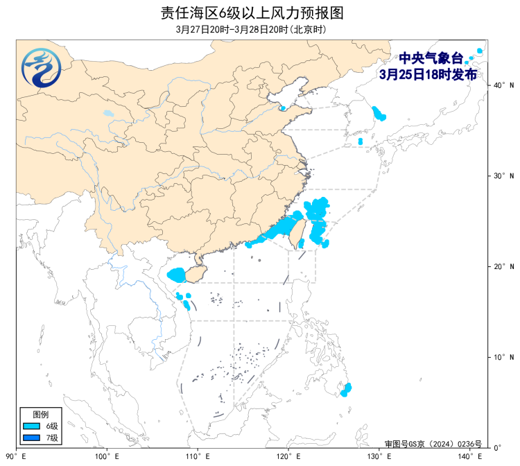 预计,3月28日夜间至4月1日白天,渤海、黄海大部海域、台湾以东洋面、南海西北部海域、南海中西部海域、南海西南部海域、南海东南部海域将有6~7级、阵风8级的风,渤海海峡、巴士海峡、北部湾将有5~6级、阵风7级的风,东海大部海域将有6~7级、阵风8级增大至8~9级、阵风10级的大风,台湾海峡将有7~8级、阵风9级的大风。
