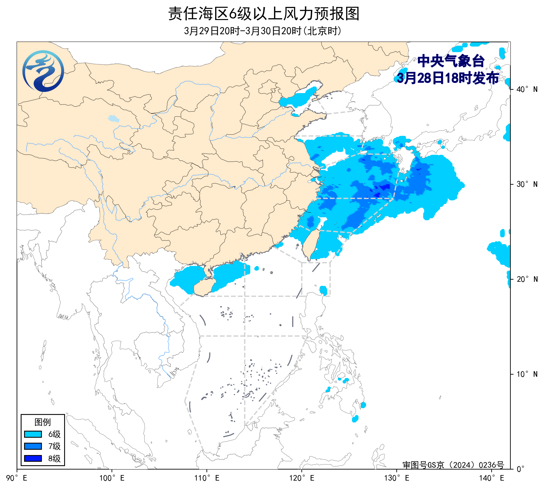 29日20时至30日20时,东海大部海域将有6~7级、阵风8级的偏南风,台湾海峡、台湾以东洋面、北部湾、南海西北部海域将有5~6级、阵风7级的偏南到西南风,渤海、黄海南部海域将有5~6级、阵风7级的偏北到东北风。